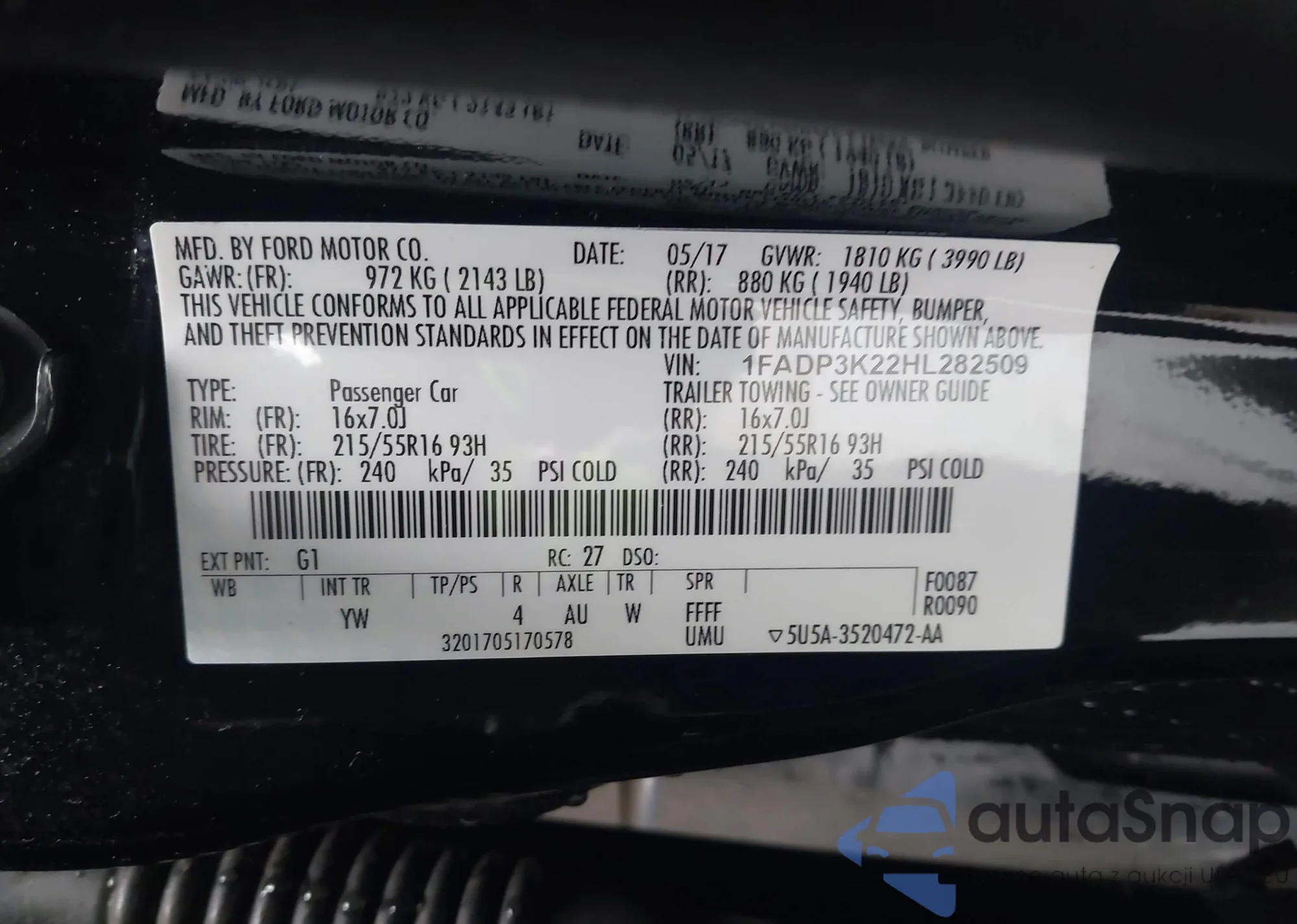 LOT: 43742631 VIN: 1FADP3K22HL282509