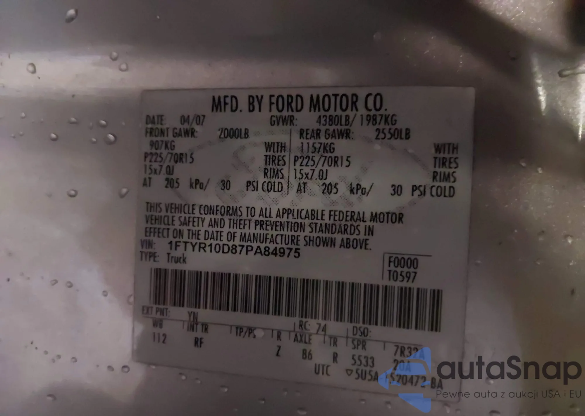 LOT: 44107550 VIN: 1FTYR10D87PA84975