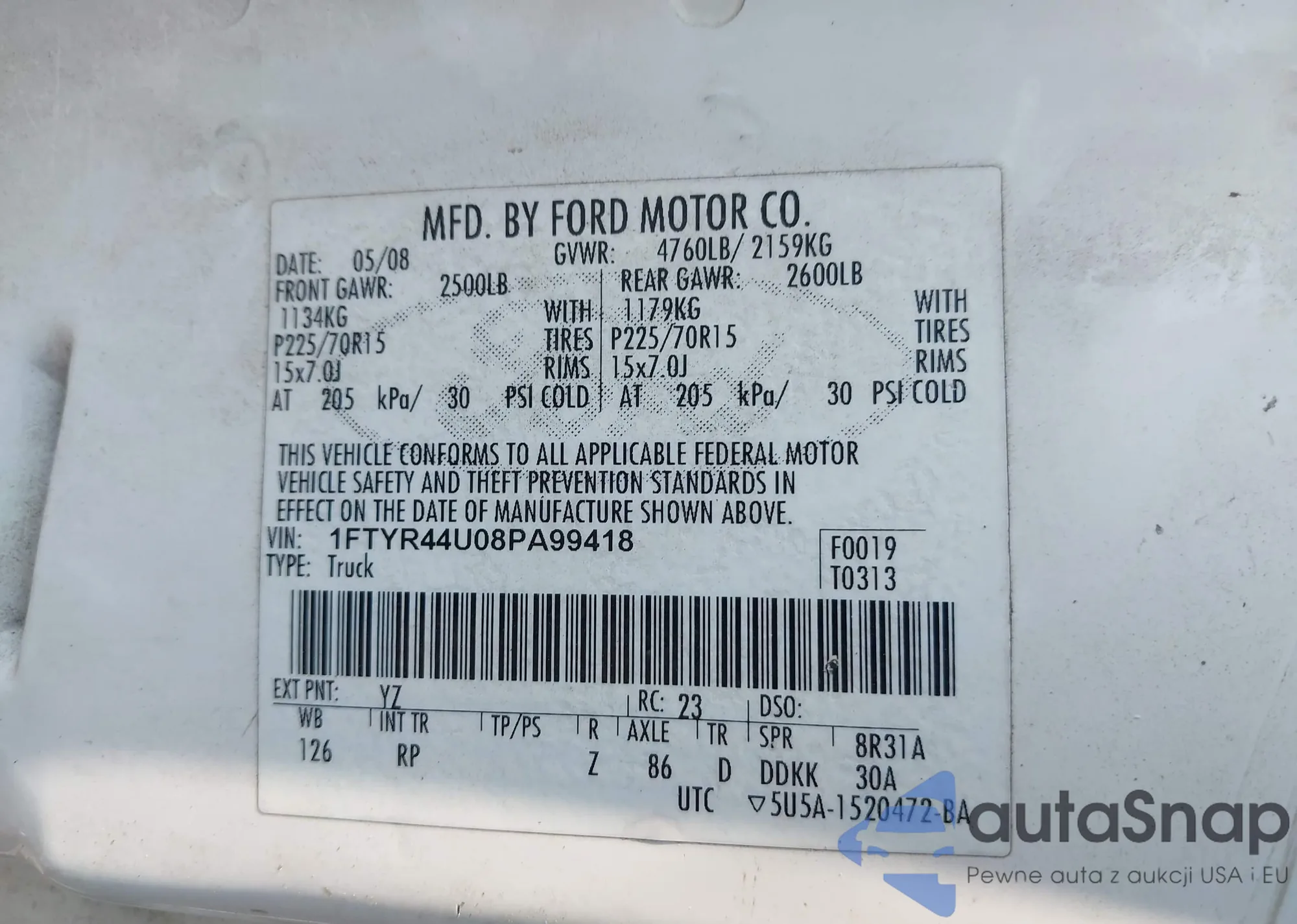 LOT: 39847678 VIN: 1FTYR14U58PA93189