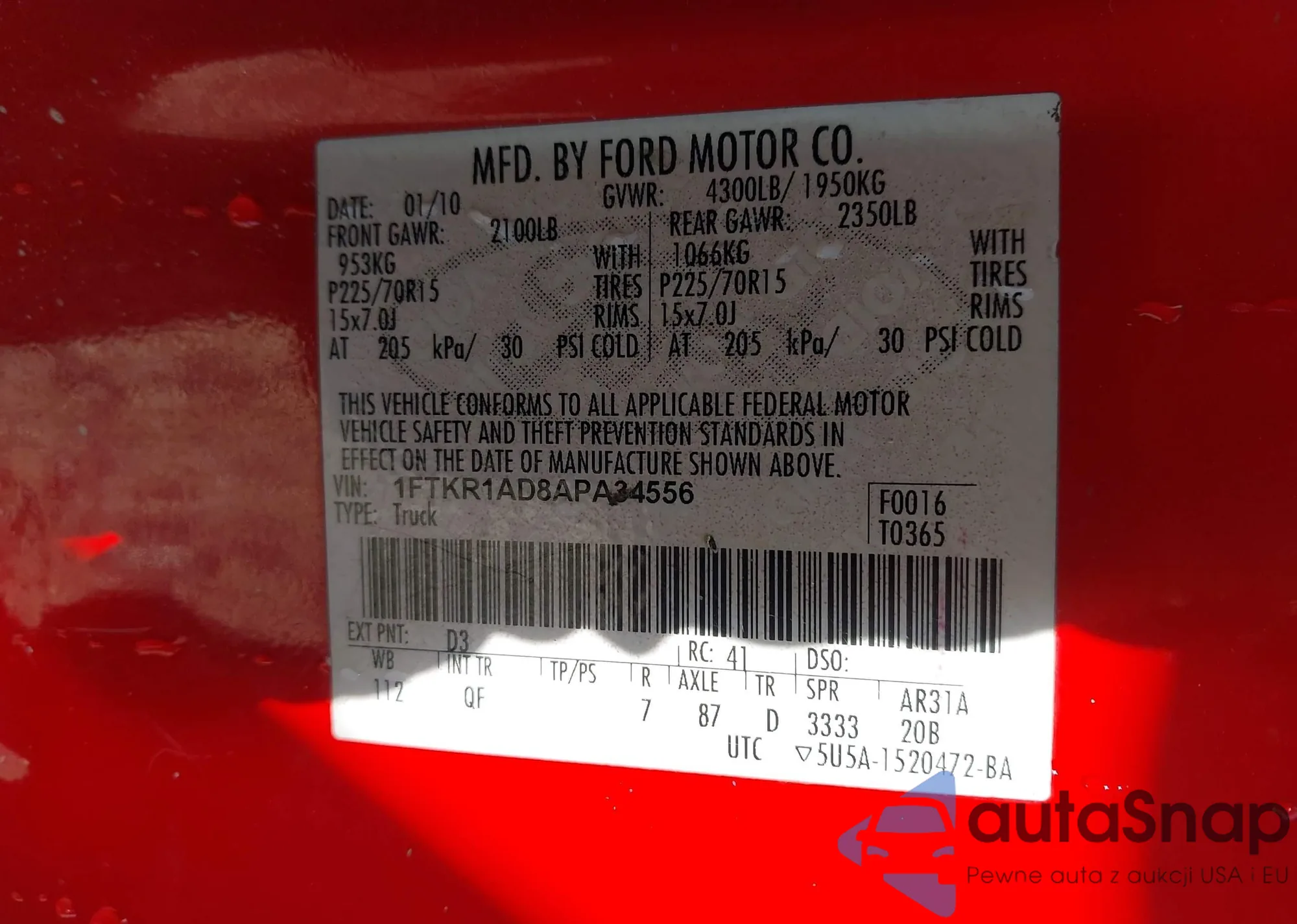 LOT: 44234725 VIN: 1FTKR1AD8APA34556
