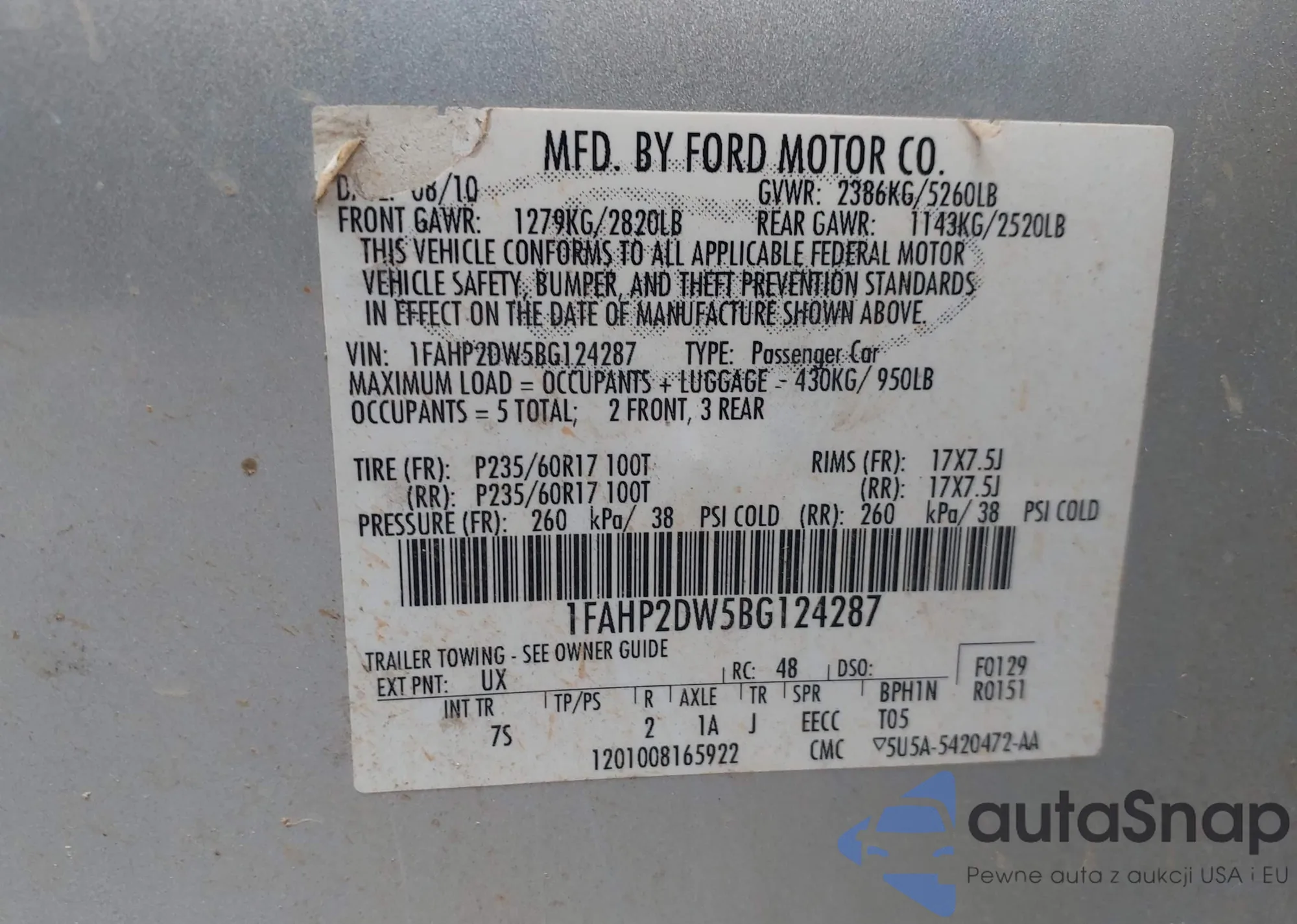 LOT: 43828182 VIN: 1FAHP2DW5BG124287