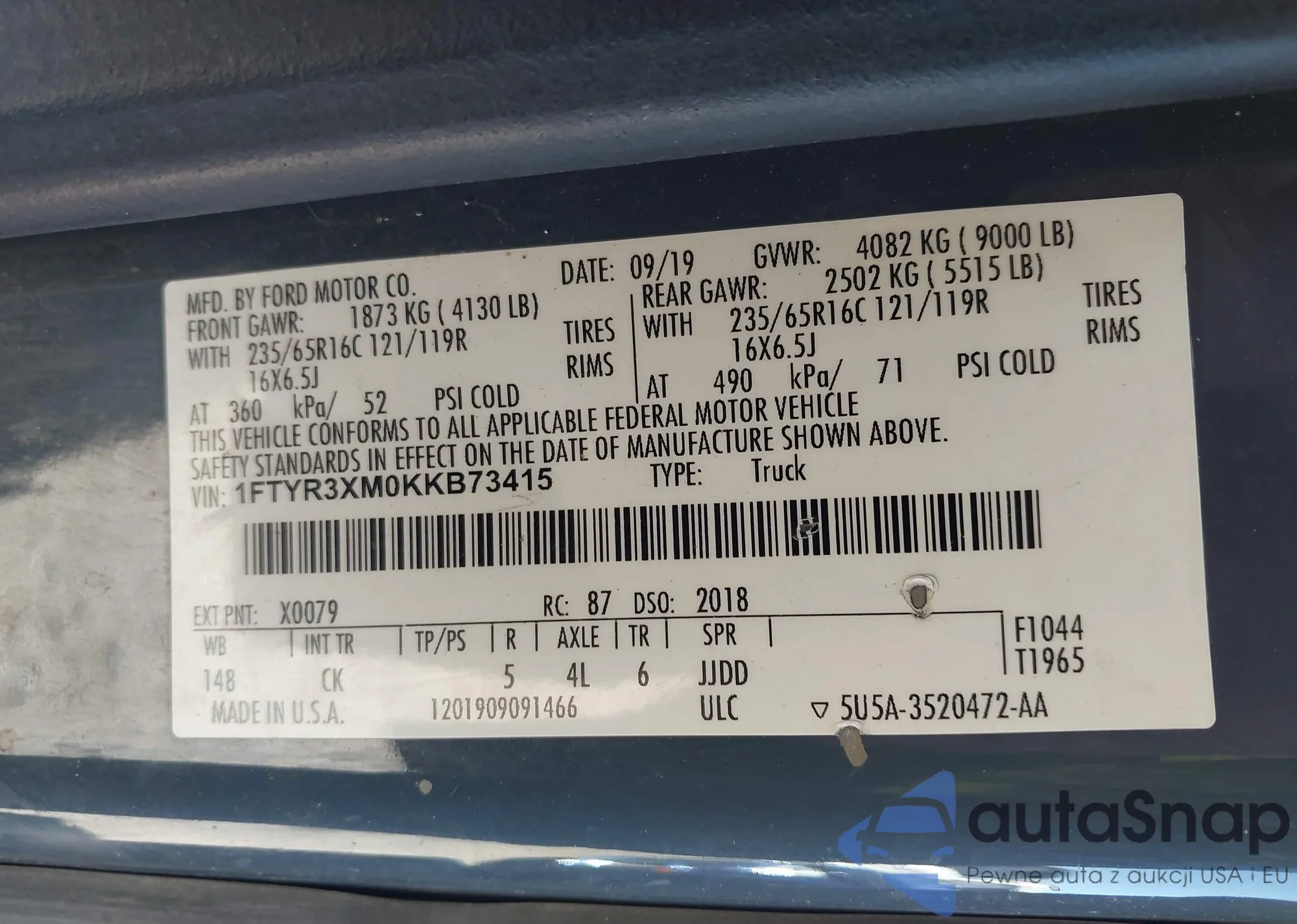 • VIN 1FTYR3XM0KKB73415