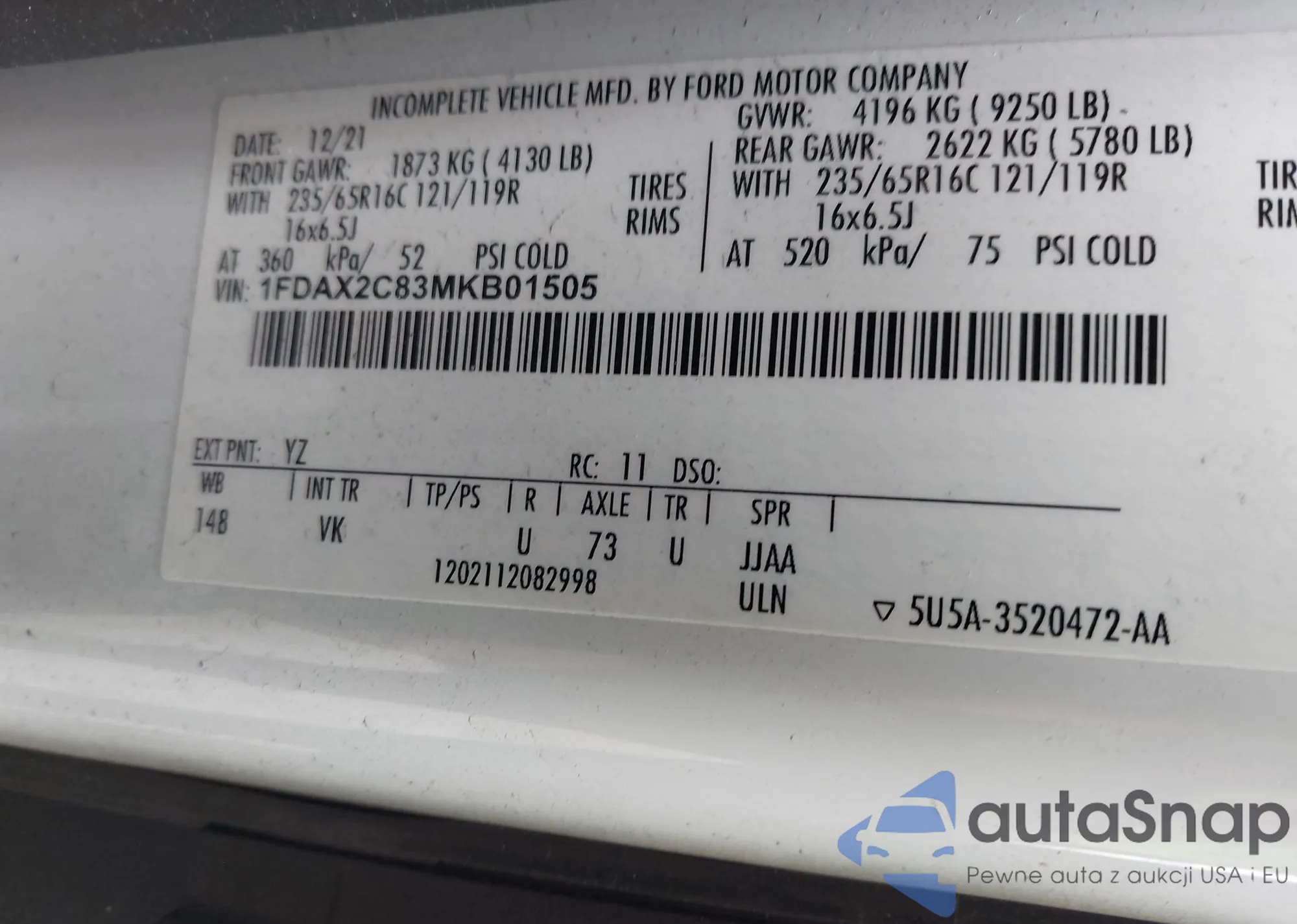 LOT: 43482554 VIN: 1FDAX2C83MKB01505