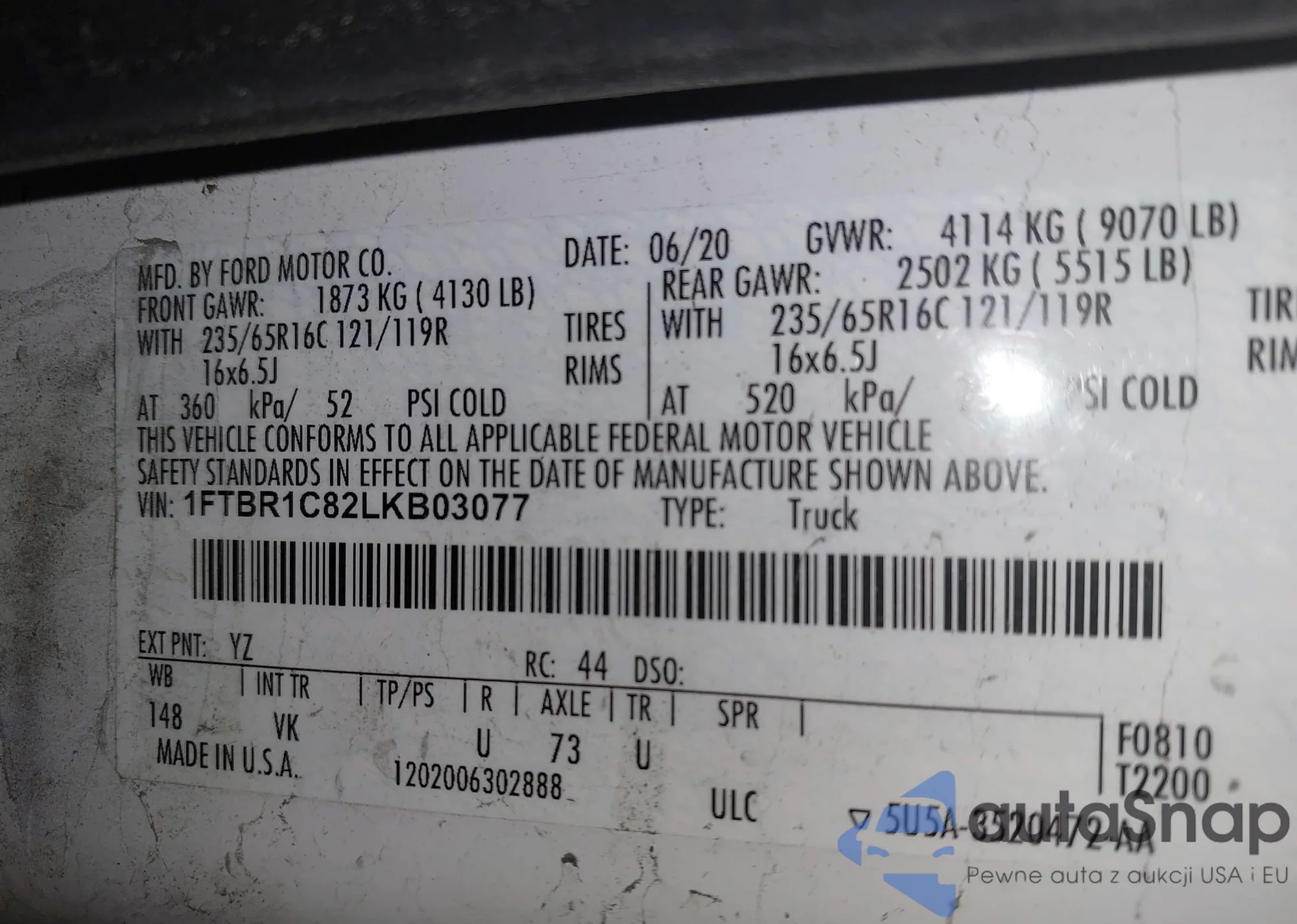 LOT: 43515528 VIN: 1FTBR1C82LKB03077