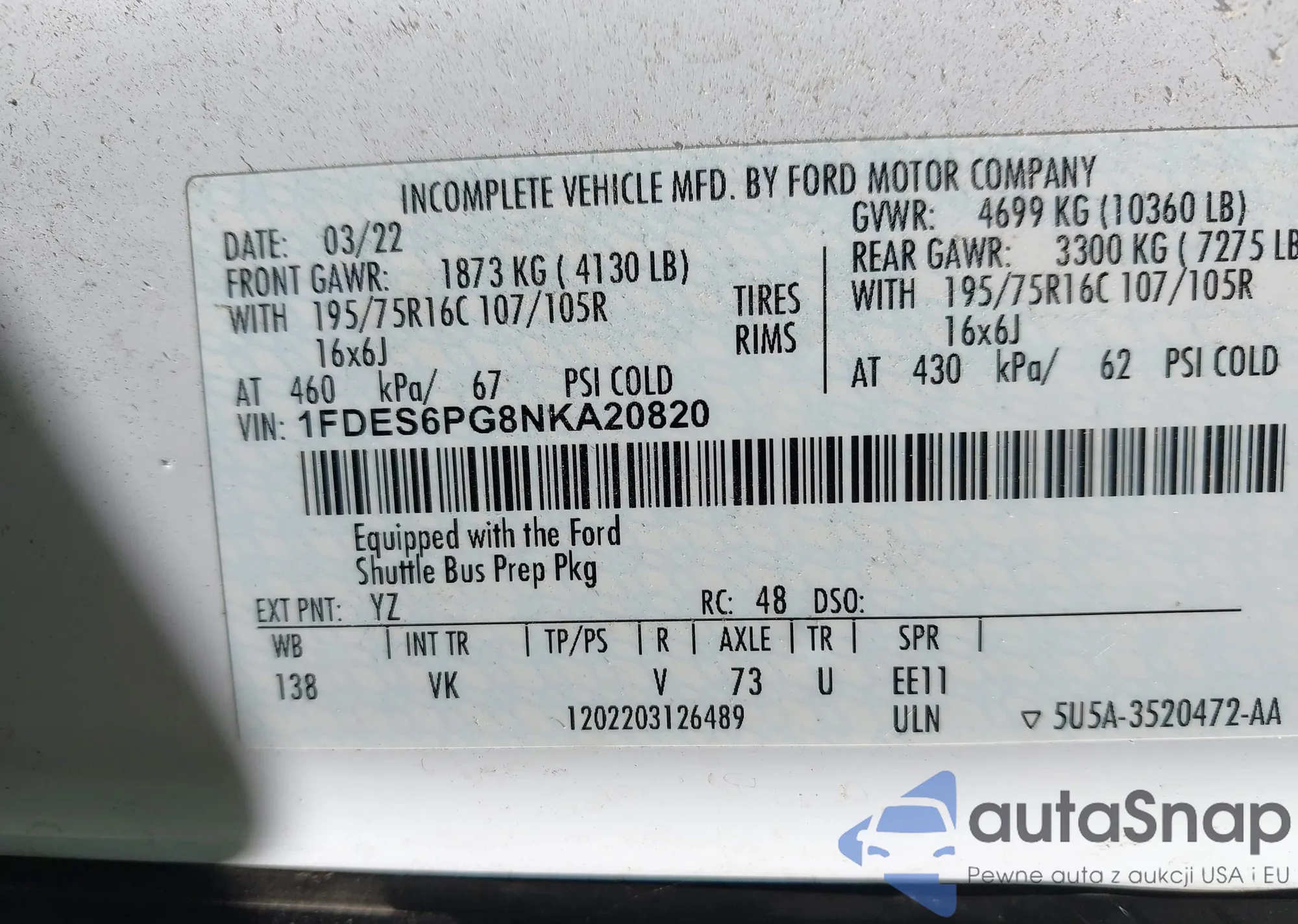 • VIN 1FDES6PG8NKA20820