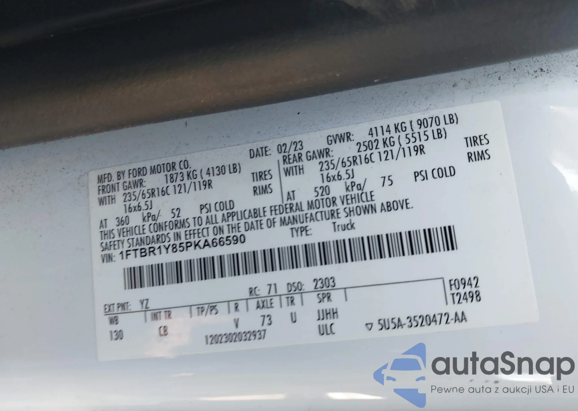 • VIN 1FTBR1Y85PKA66590