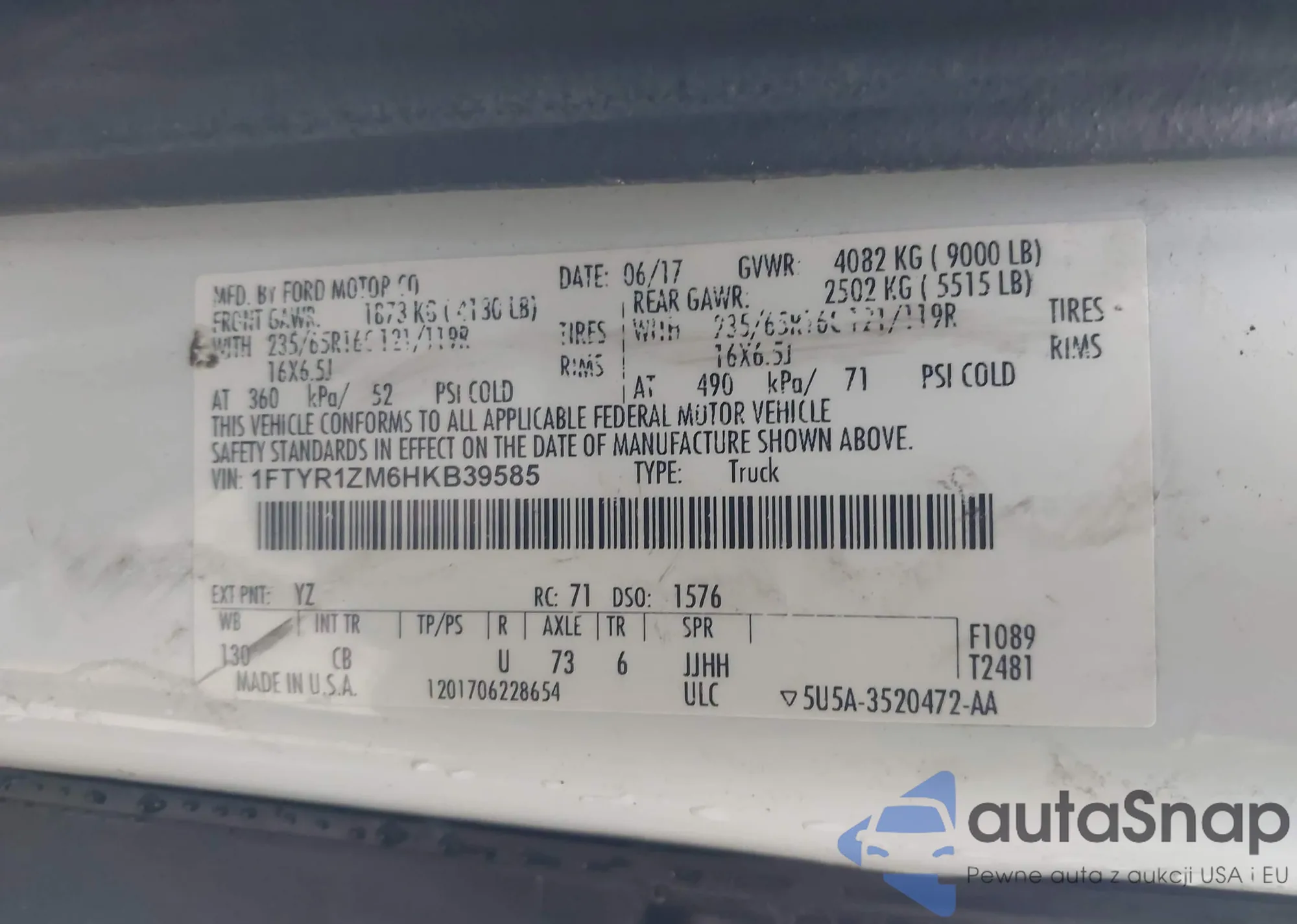 • VIN 1FTYR1ZM6HKB39585