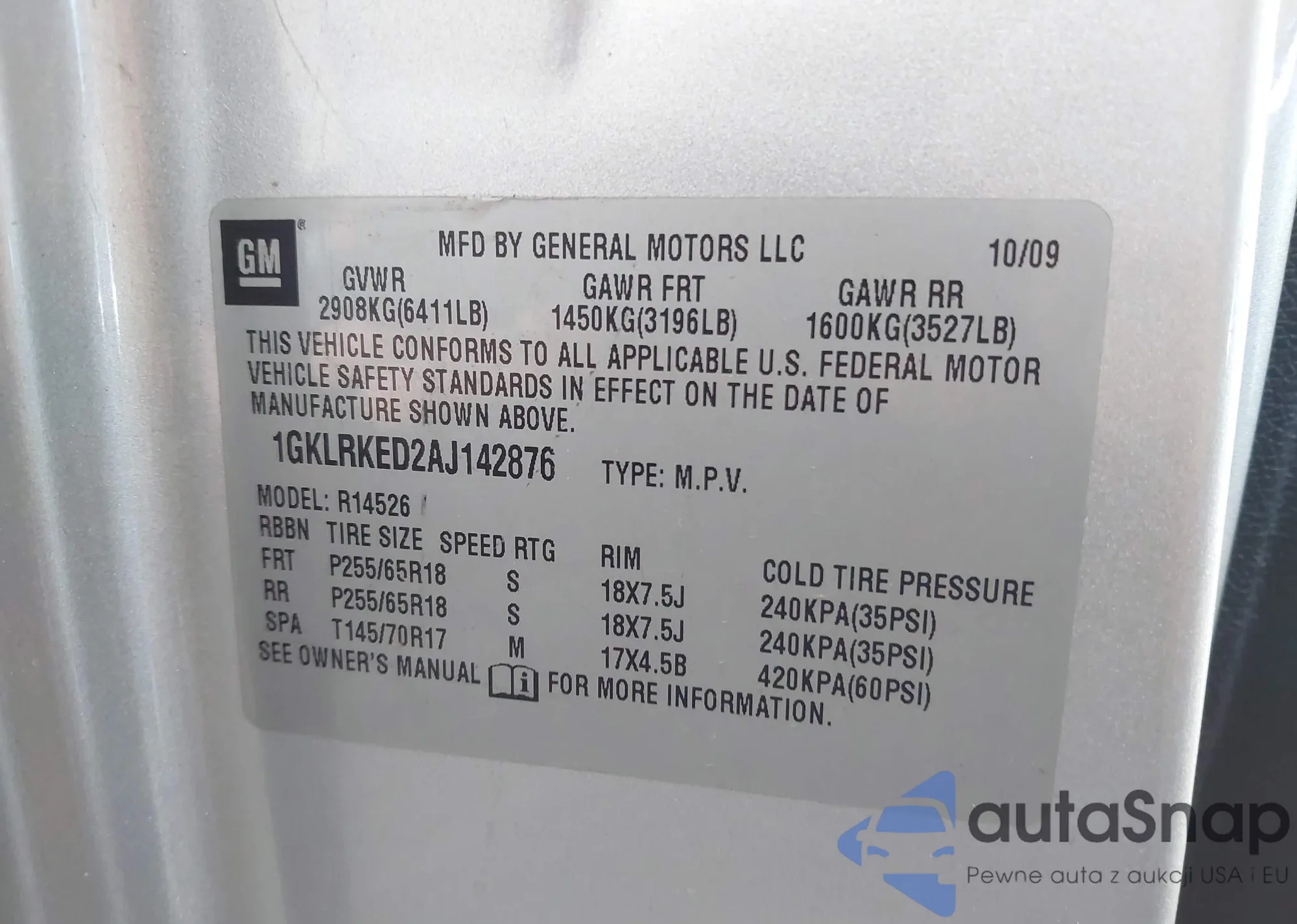 • VIN 1GKLRKED2AJ142876