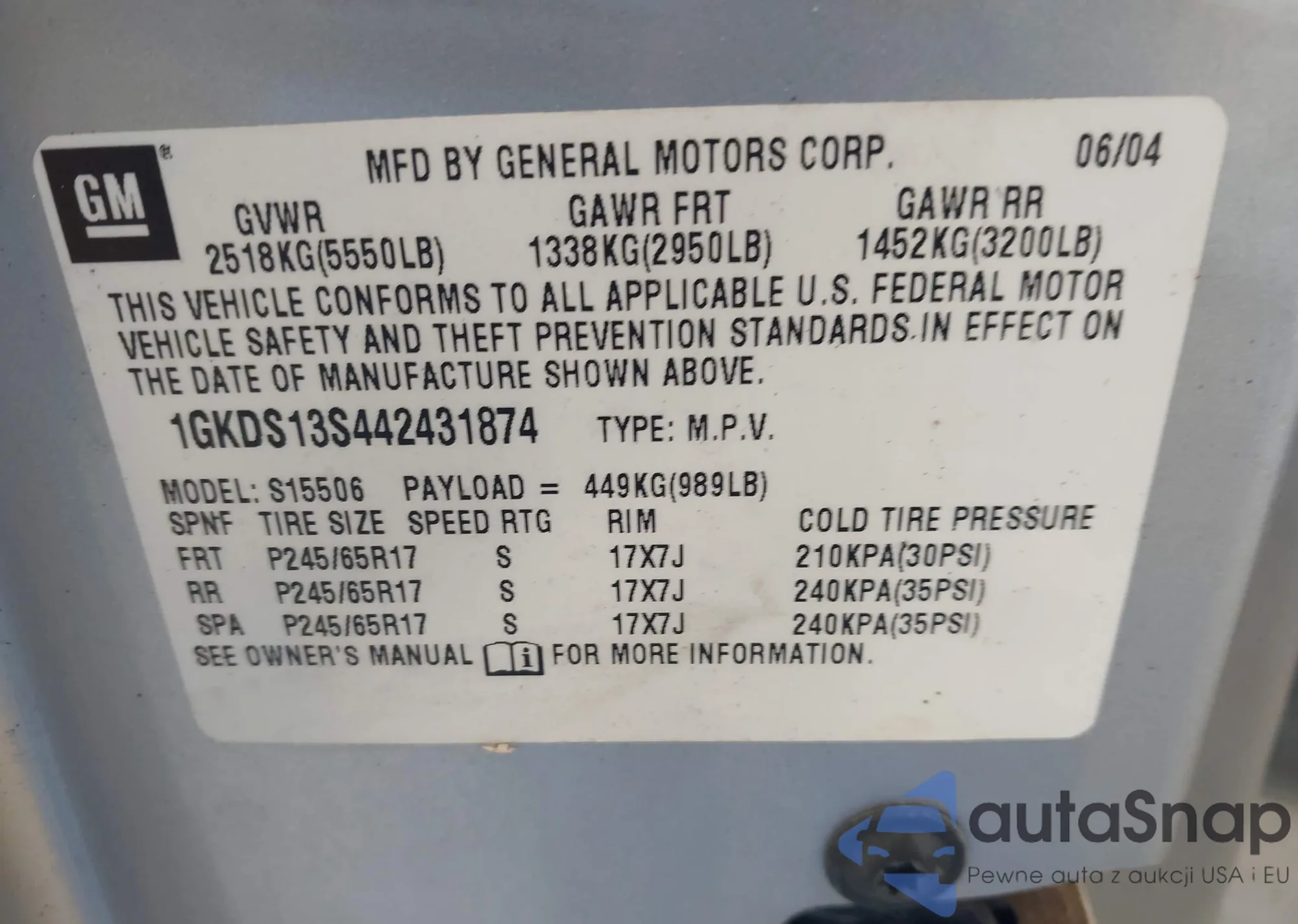 • VIN 1GKDS13S442431874