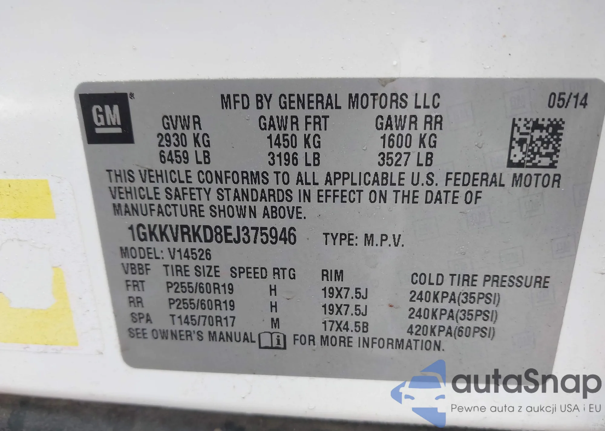 • VIN 1GKKVRKD8EJ375946