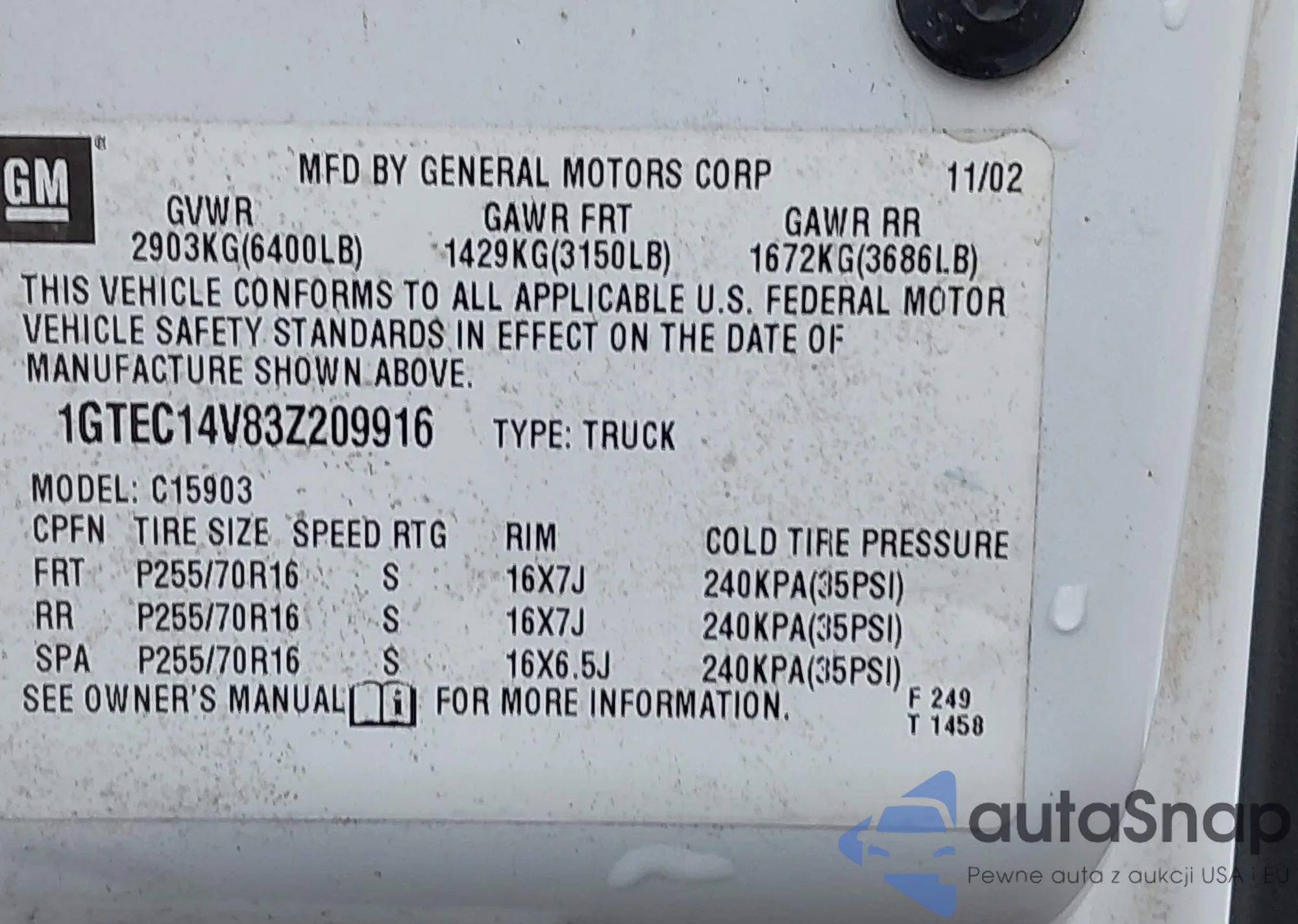 • VIN 1GTEC14V83Z209916