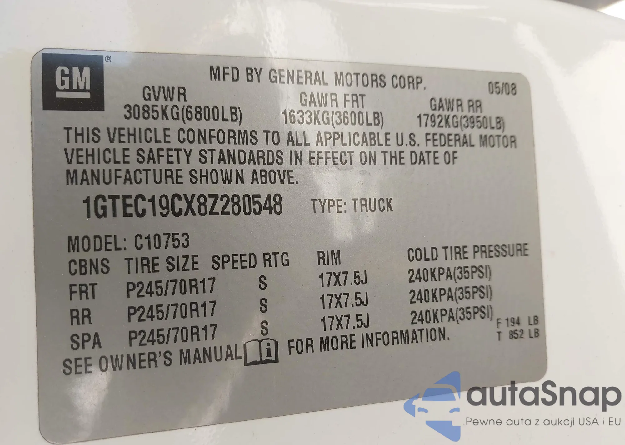 • VIN 1GTEC19CX8Z280548