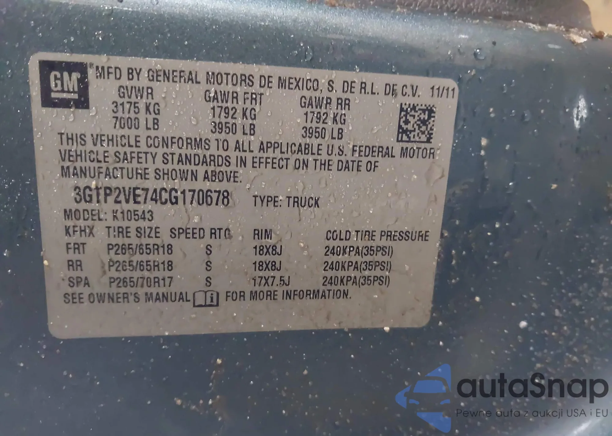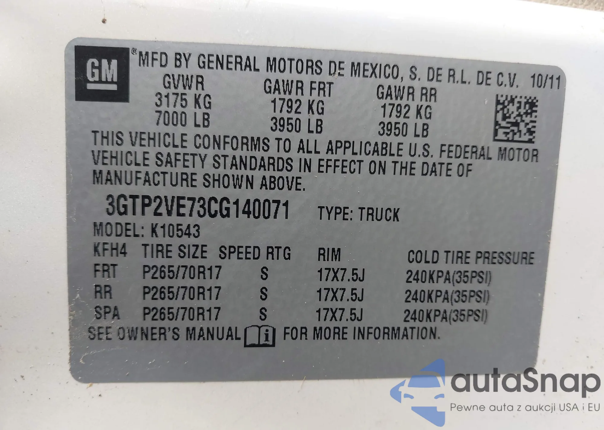 • VIN 3GTP2VE73CG140071