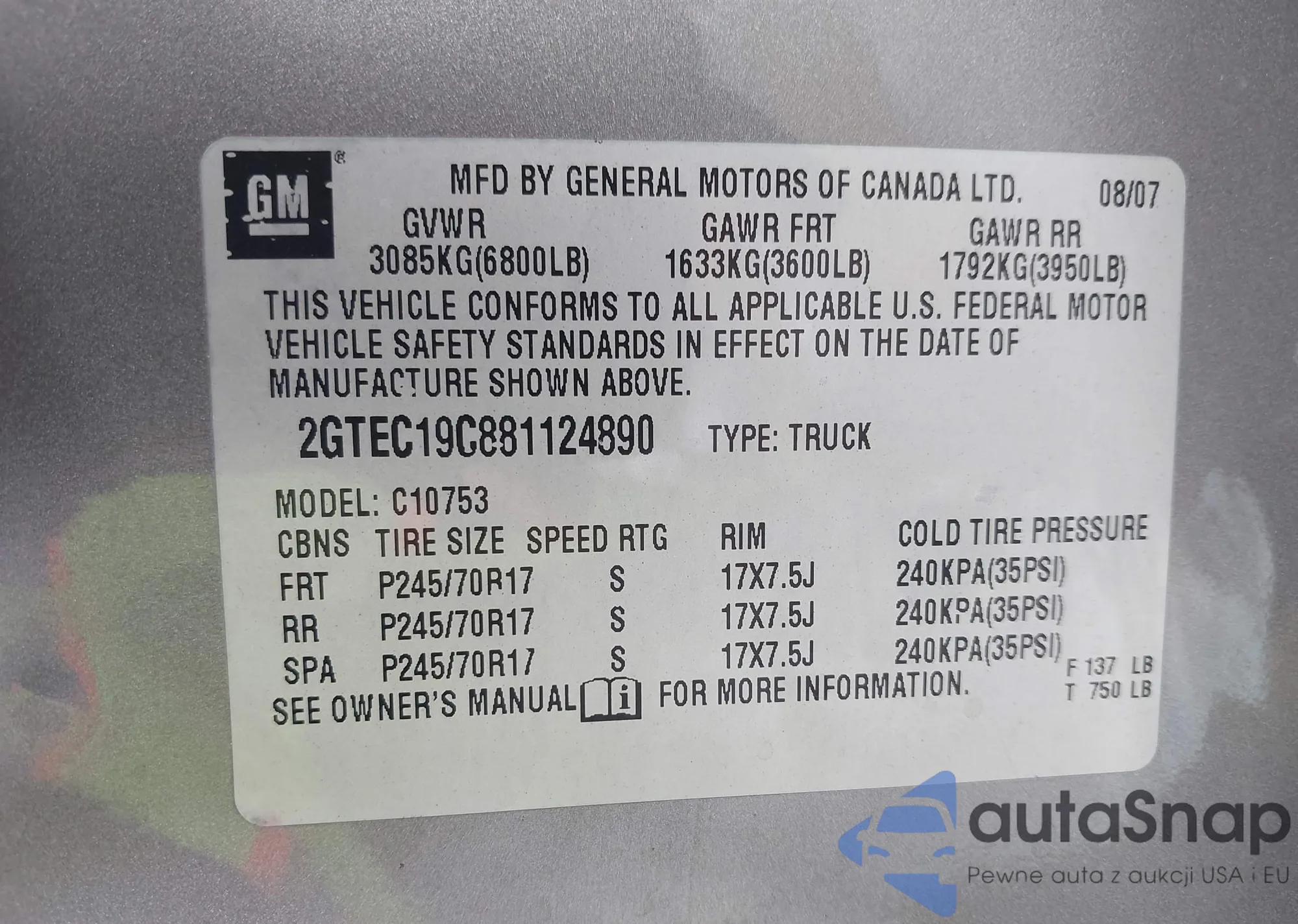 • VIN 2GTEC19C881124890