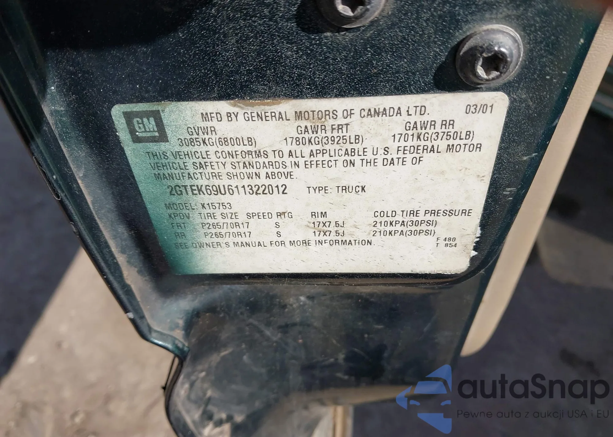 • VIN 2GTEK69U611322012