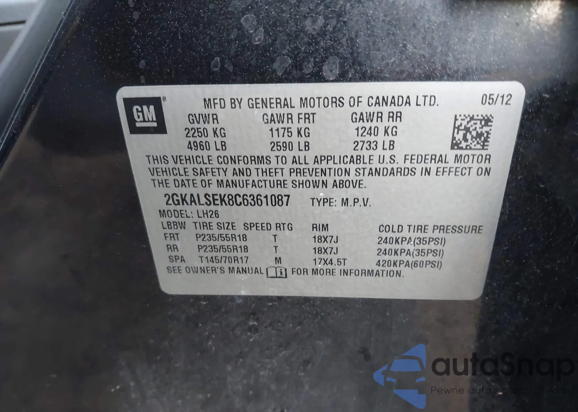 LOT: 43615605 VIN: 2GKALSEK8C6361087
