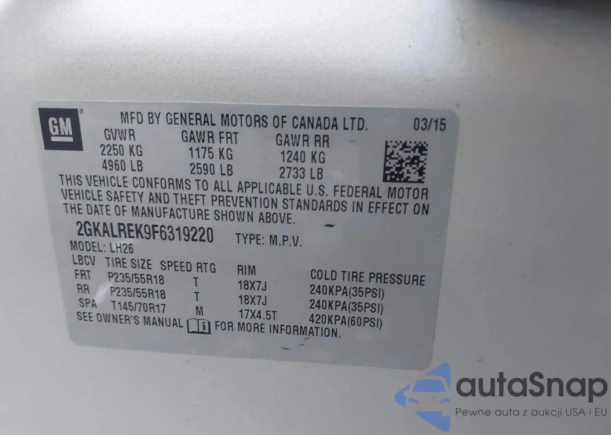 • VIN 2GKALREK0F6225890