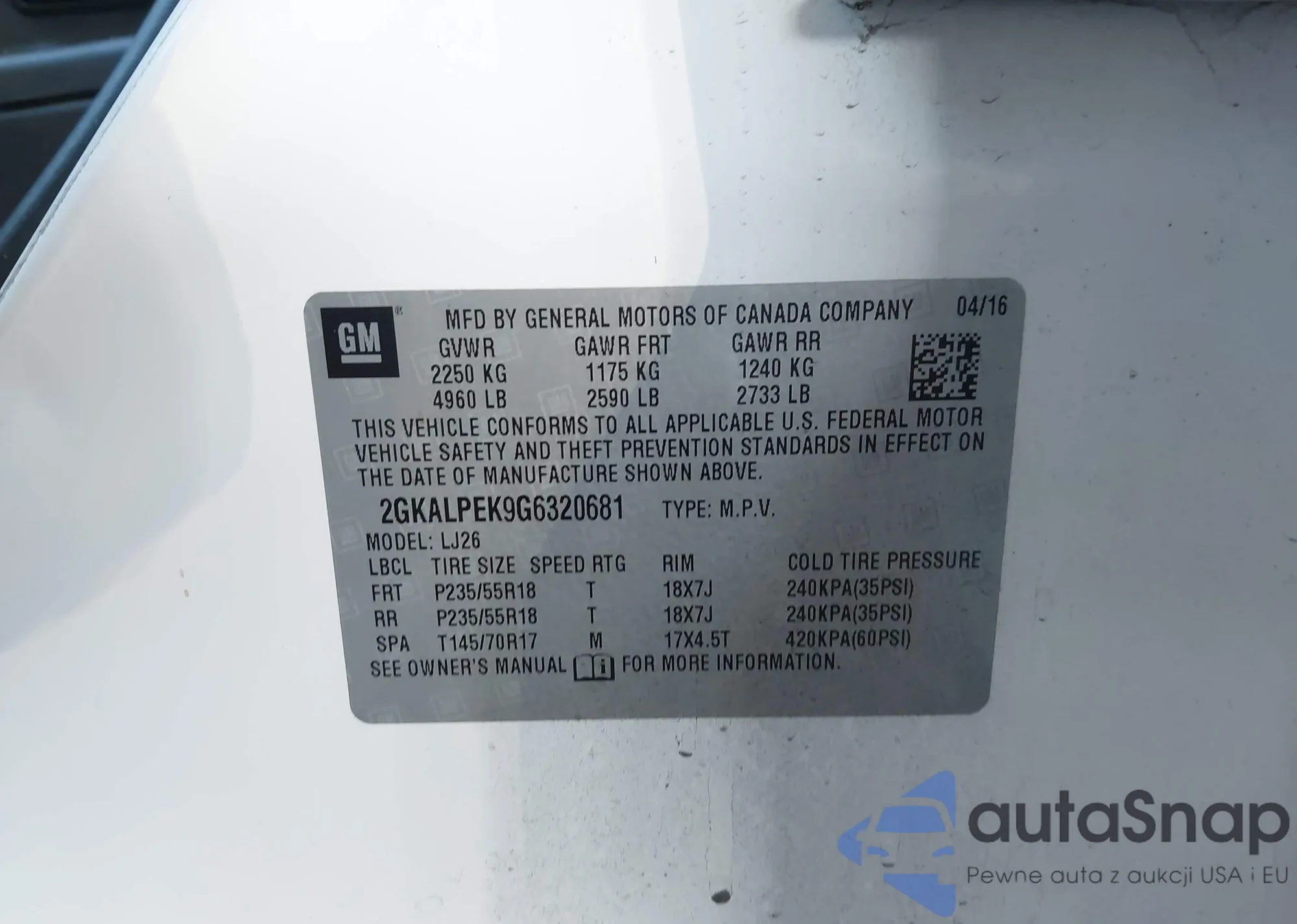 • VIN 2GKALPEK9G6320681