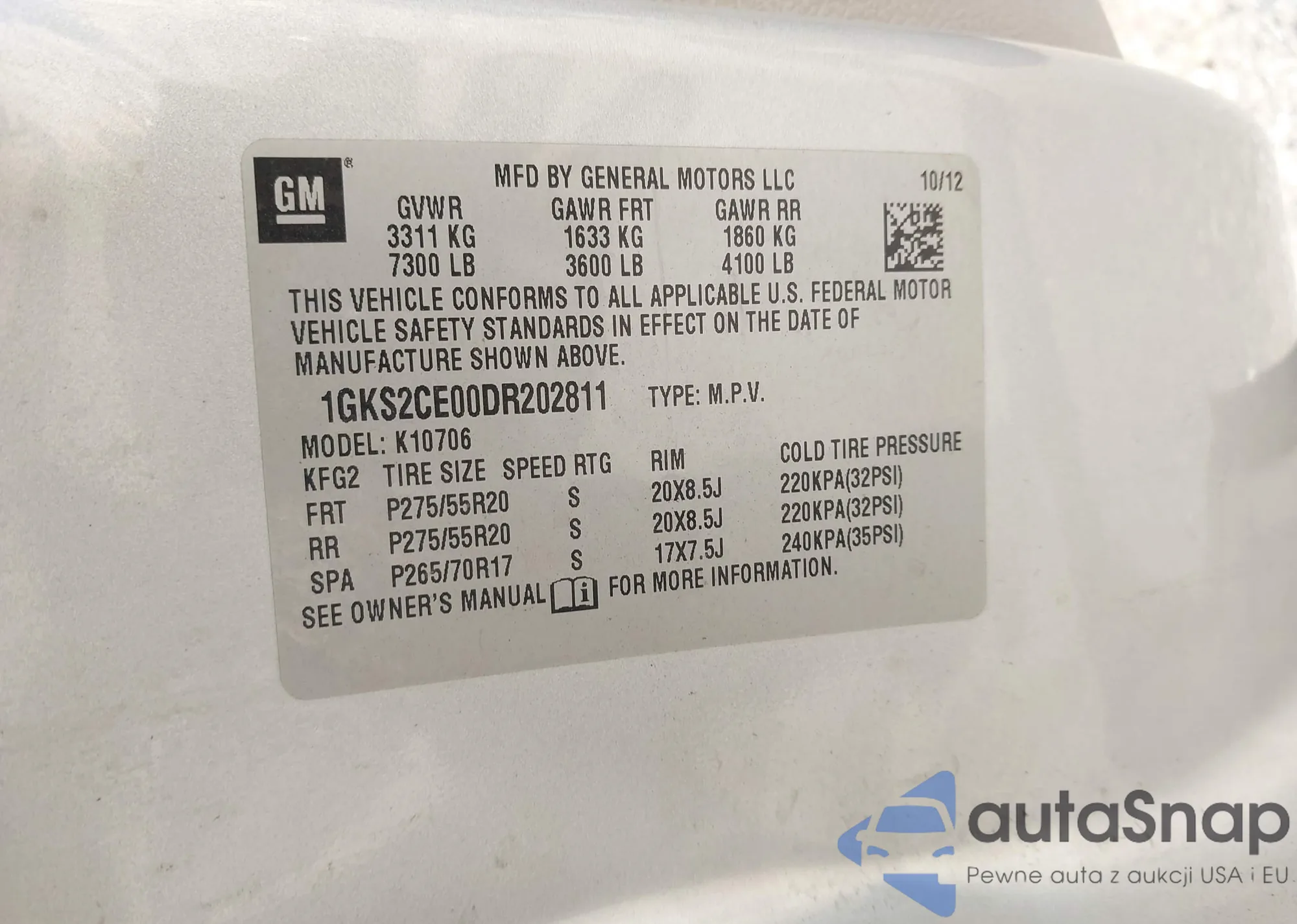 LOT: 43543486 VIN: 1GKS2CE00DR202811