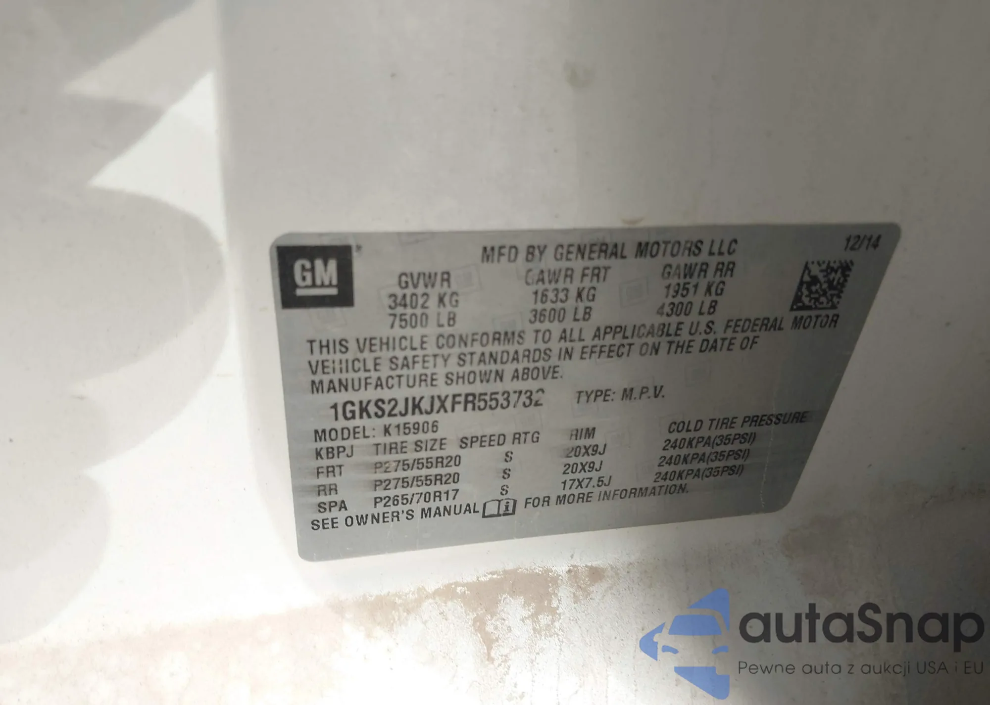 LOT: 44159449 VIN: 1GKS2JKJ8FR285781