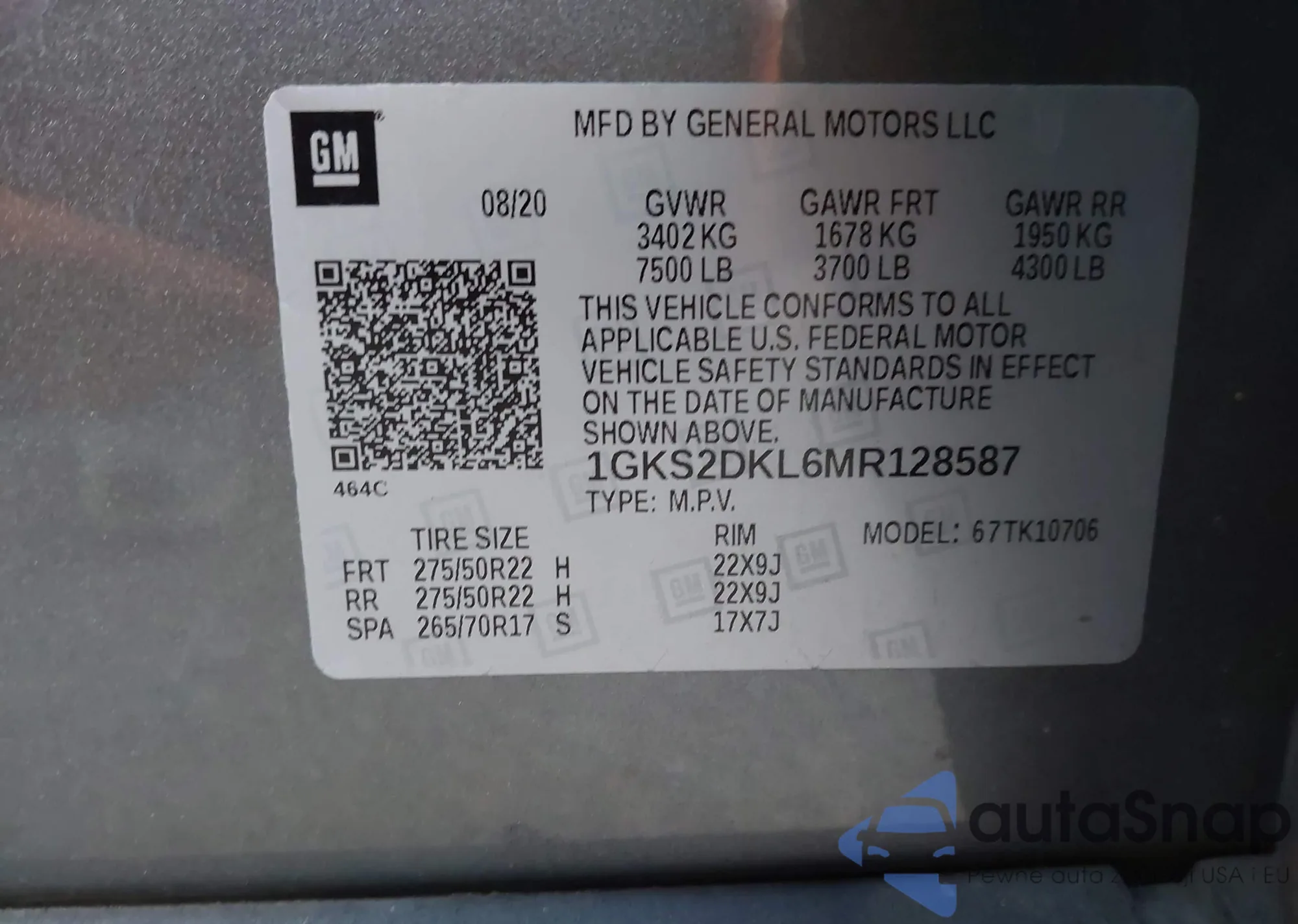 LOT: 44012790 VIN: 1GKS2DKL6MR128587