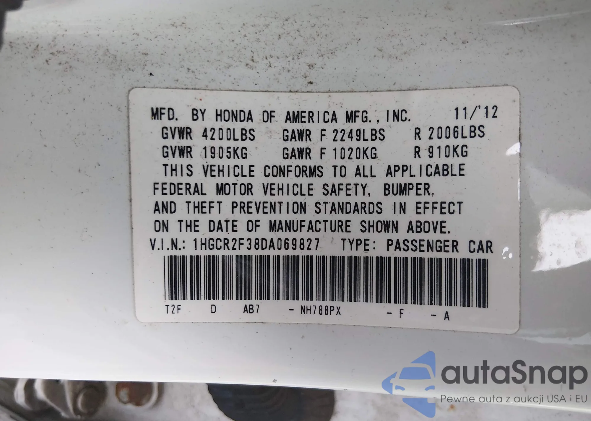 • VIN 1HGCR2F38DA069827