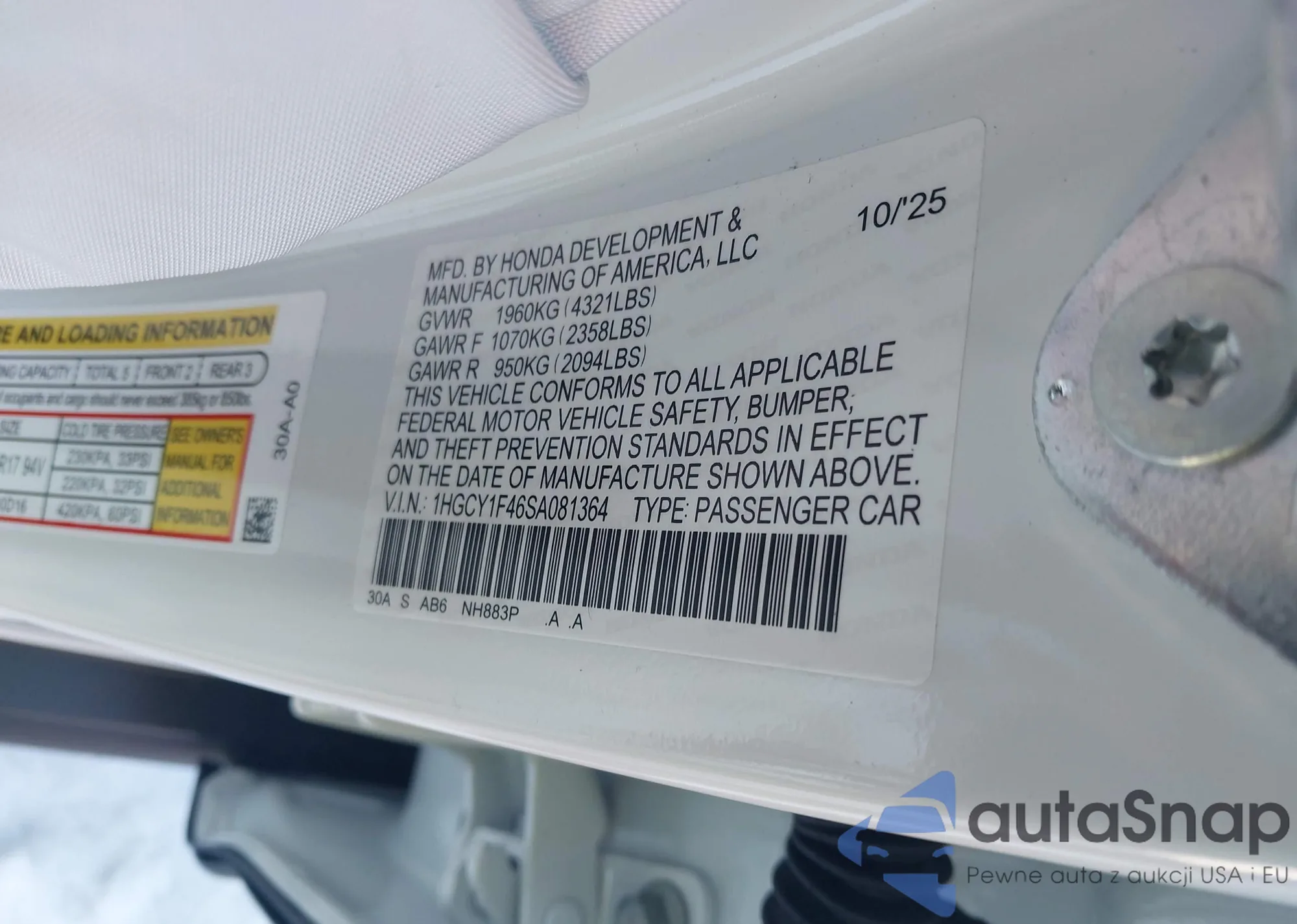 • VIN 1HGCY1F46SA081364