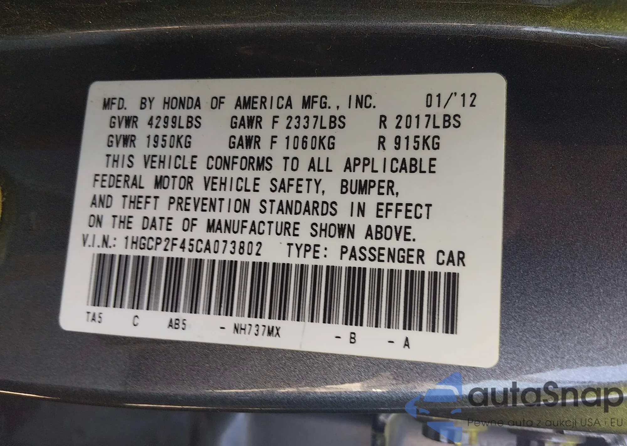 LOT: 44548286 VIN: 1HGCP2F45CA073802