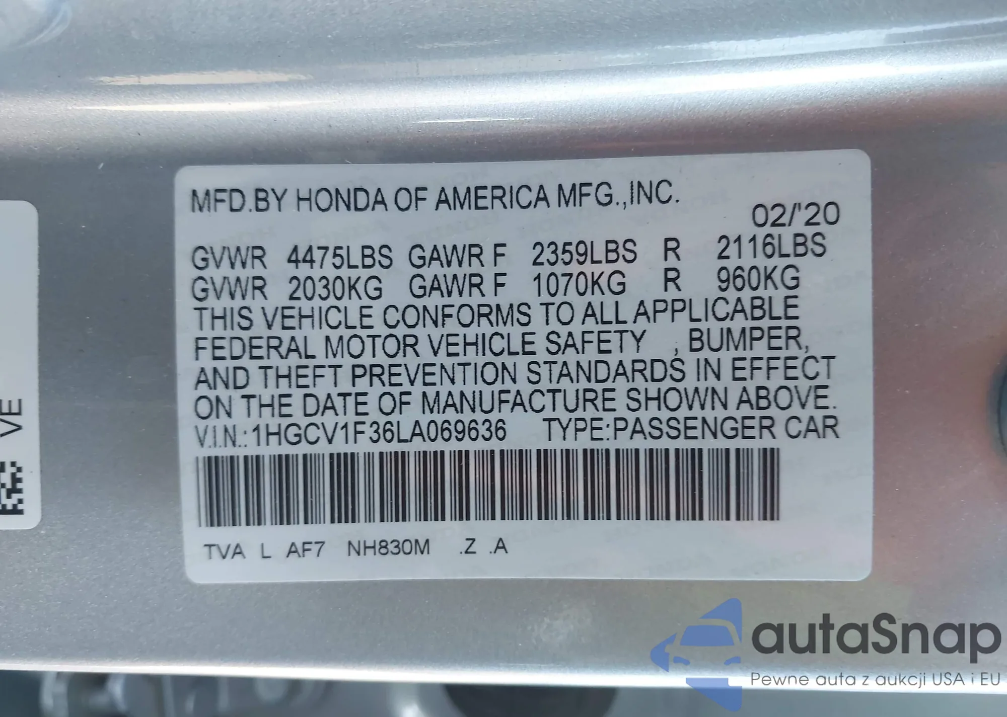 • VIN 1HGCV1F36LA069636