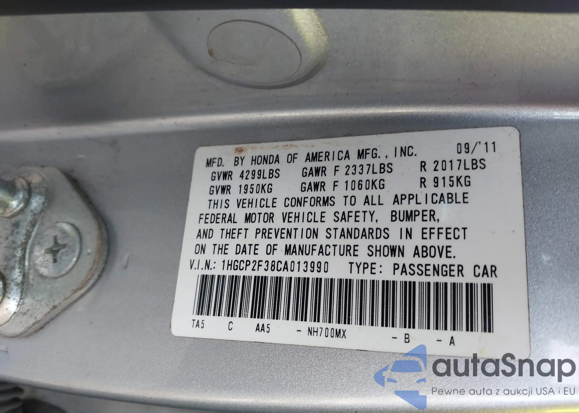 LOT: 44605690 VIN: 1HGCP2F38CA013990