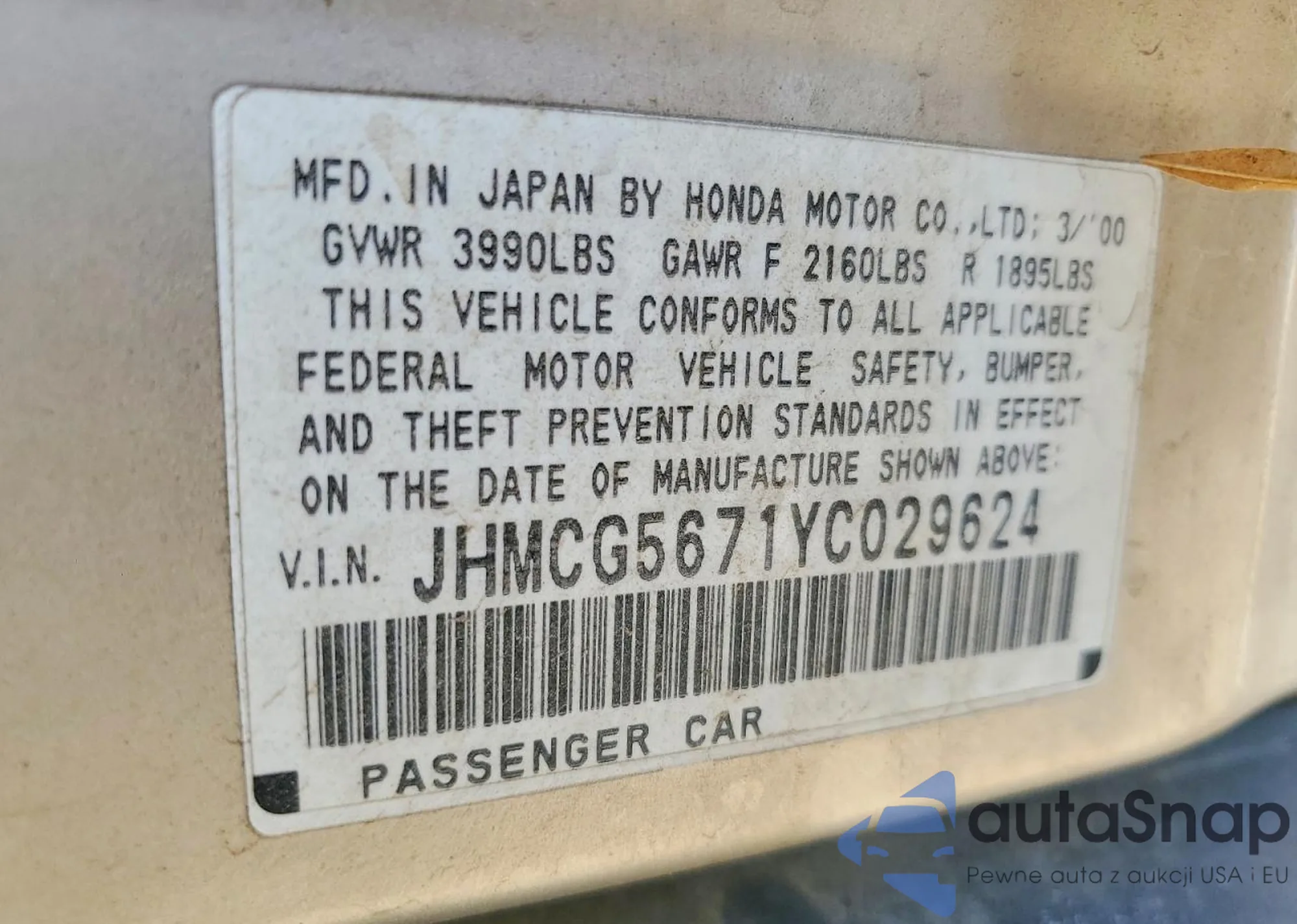 LOT: 75422635 VIN: 1HGCG1657YA004667
