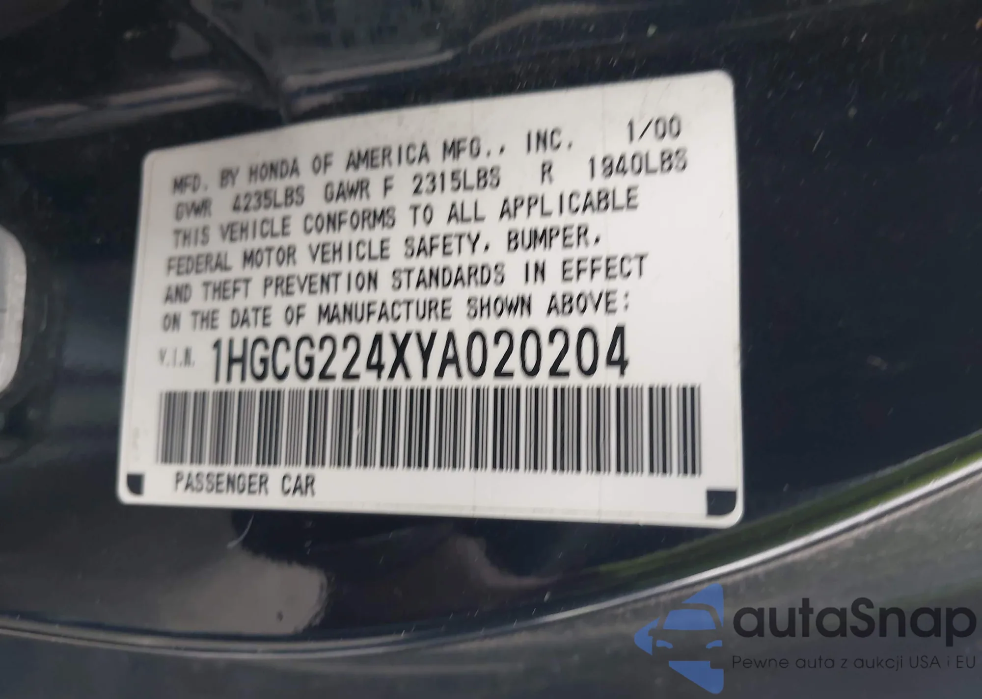 LOT: 44199546 VIN: 1HGCG224XYA020204