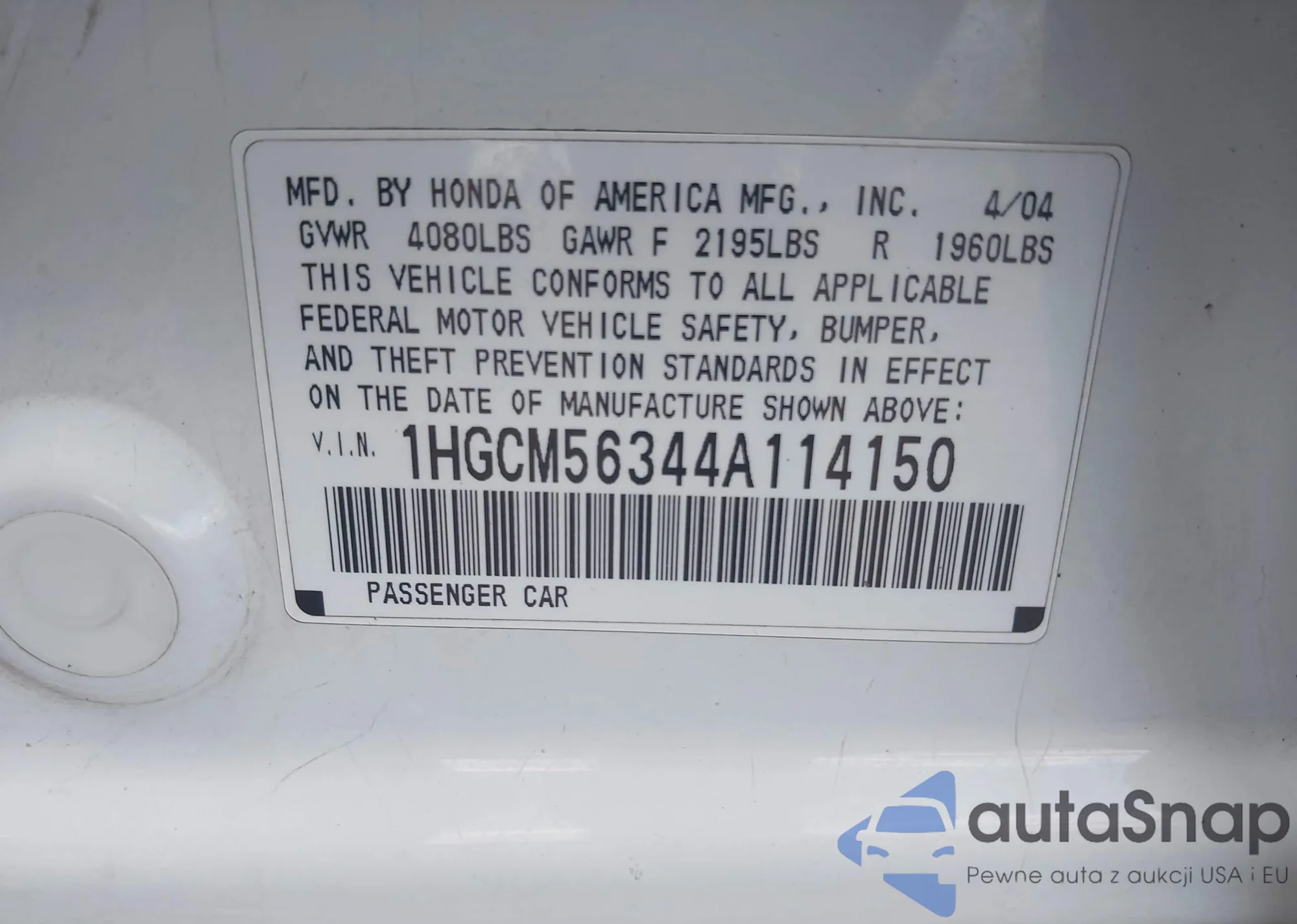LOT: 43969458 VIN: 1HGCM56344A114150