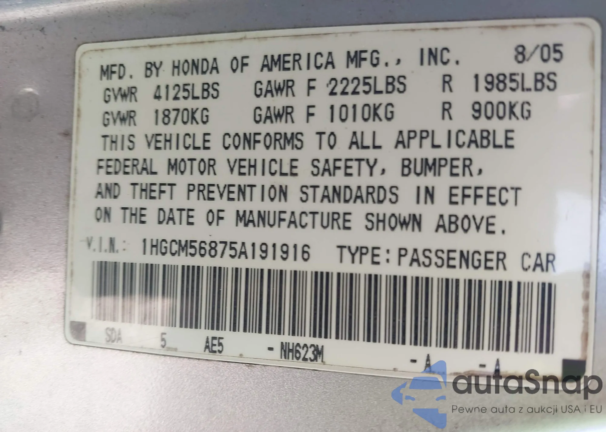 LOT: 44250010 VIN: 1HGCM56875A191916
