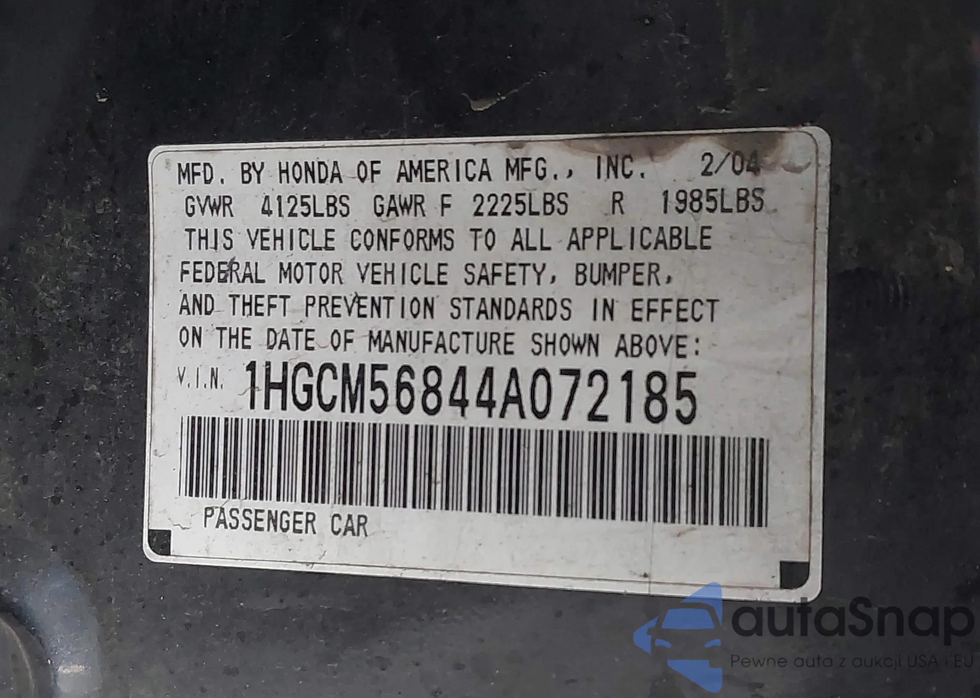 LOT: 44256063 VIN: 1HGCM56844A072185