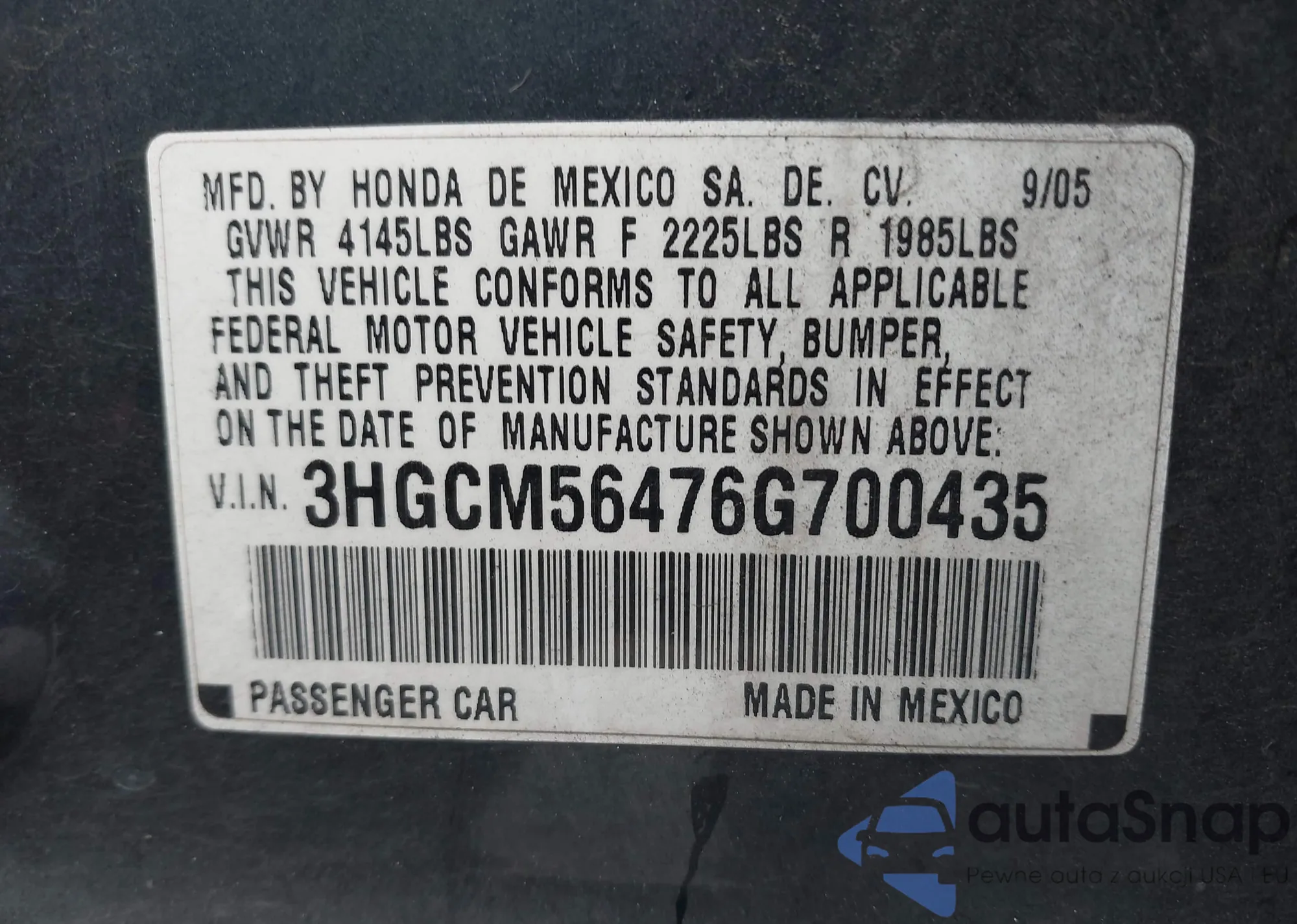LOT: 44258235 VIN: 3HGCM56476G700435