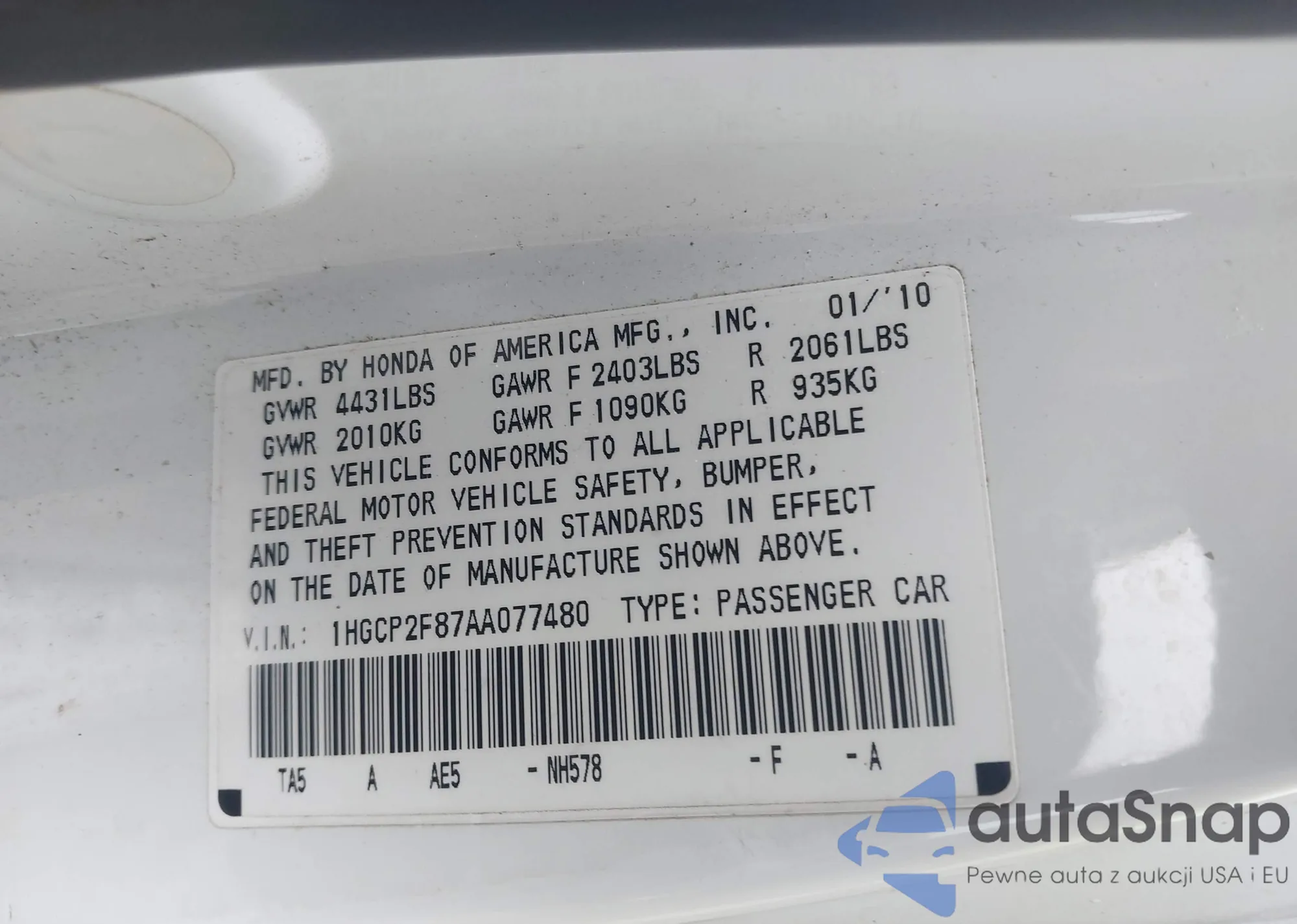 LOT: 43872360 VIN: 1HGCP2F87AA077480