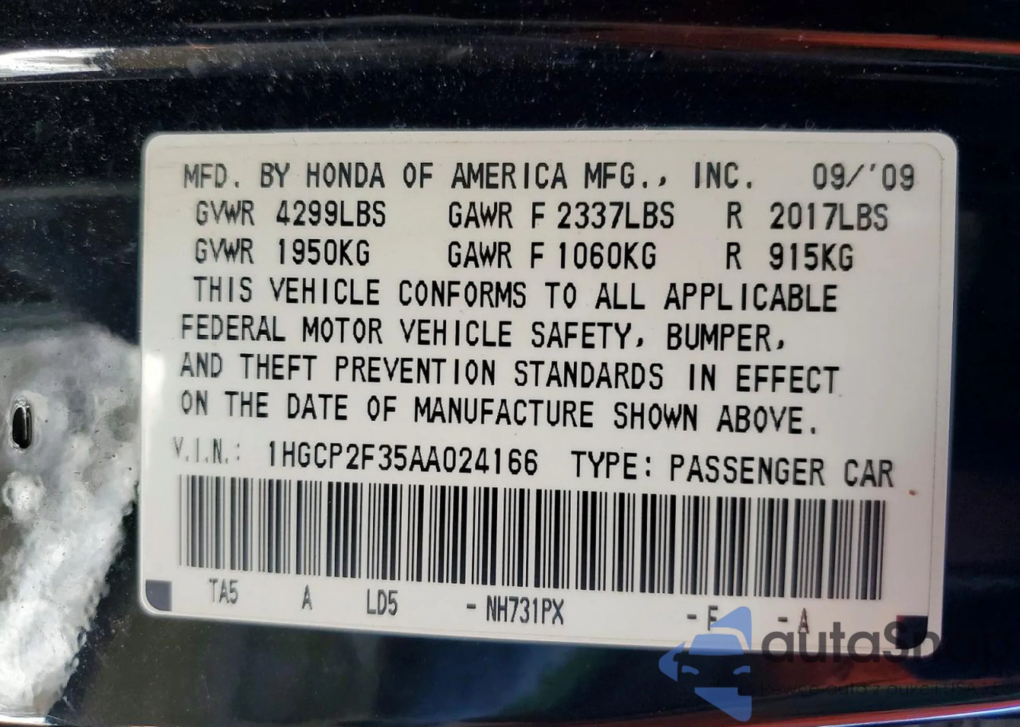 • VIN 1HGCP2F35AA024166
