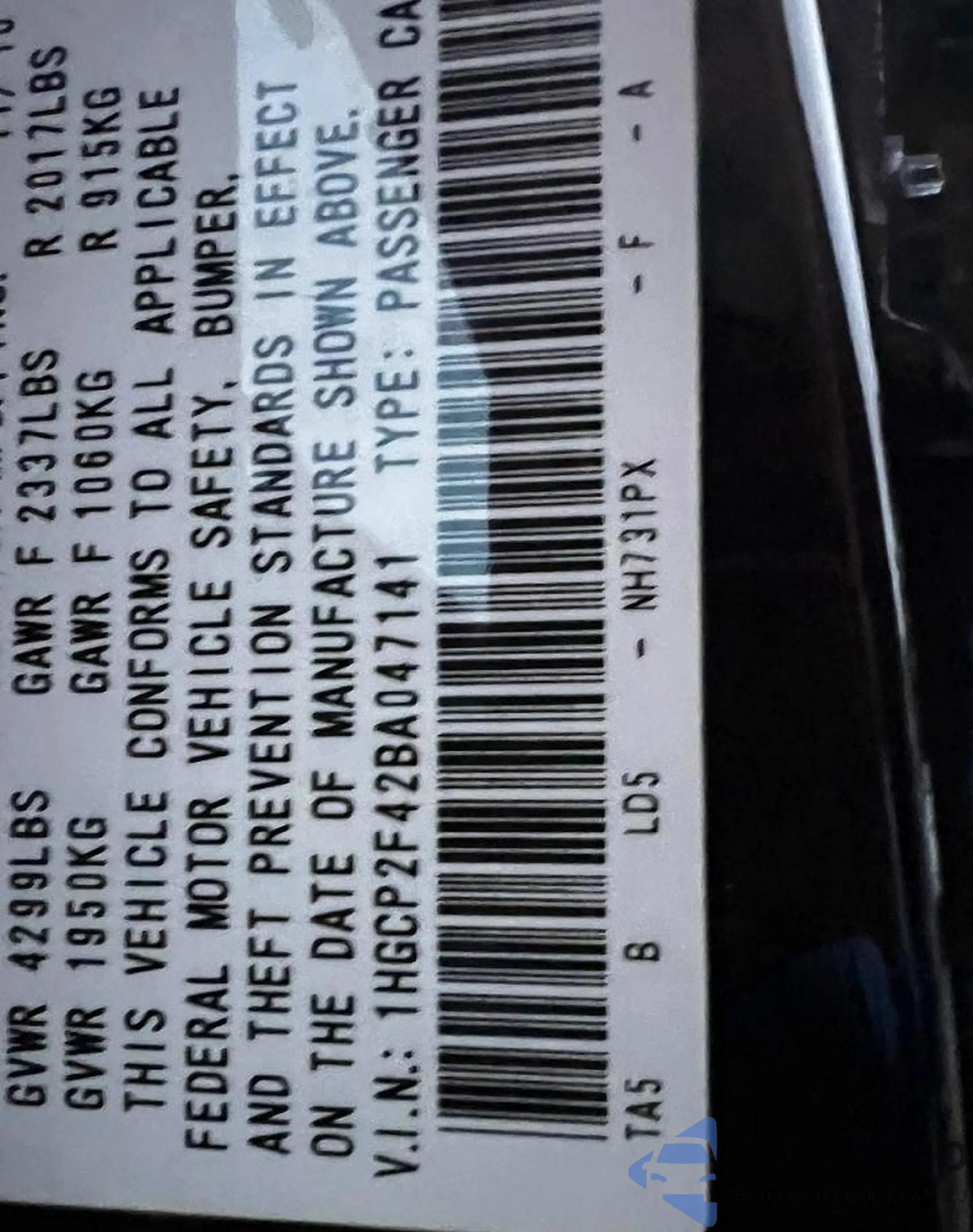 • VIN 1HGCP2F42BA047141