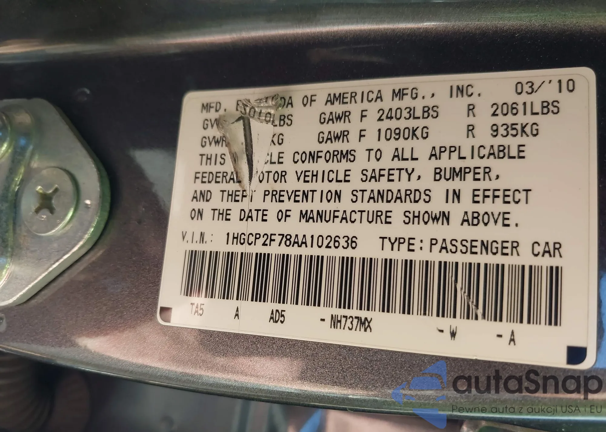 LOT: 44109323 VIN: 1HGCP2F78AA102636