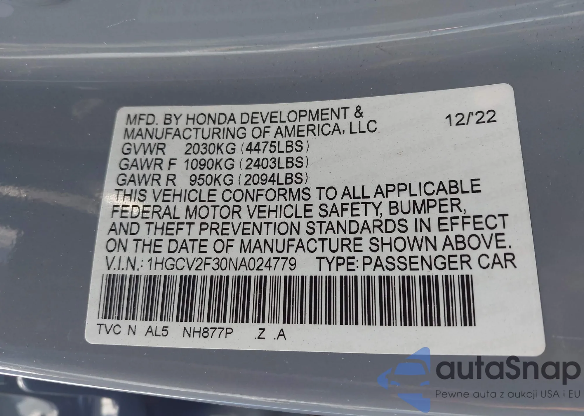 • VIN 1HGCV2F30NA024779