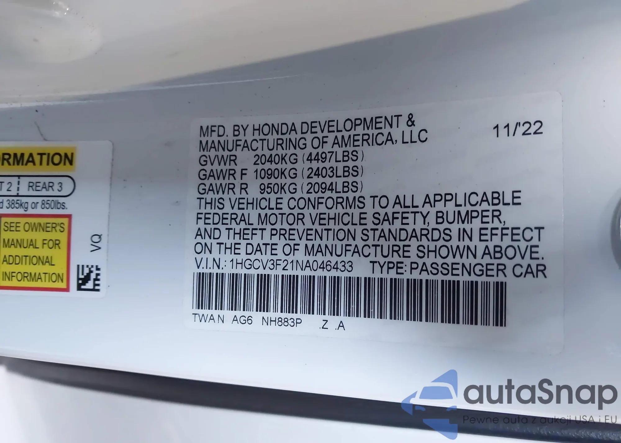 • VIN 1HGCV3F21NA046433