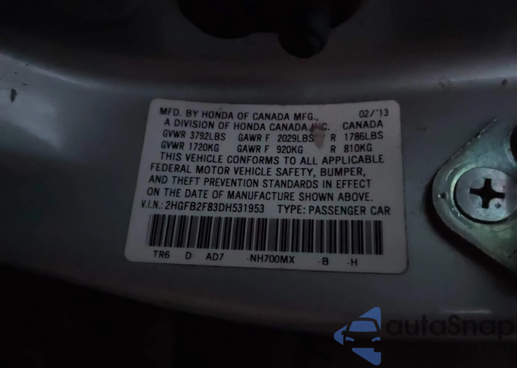 LOT: 42900429 VIN: 2HGFB2F83DH531953