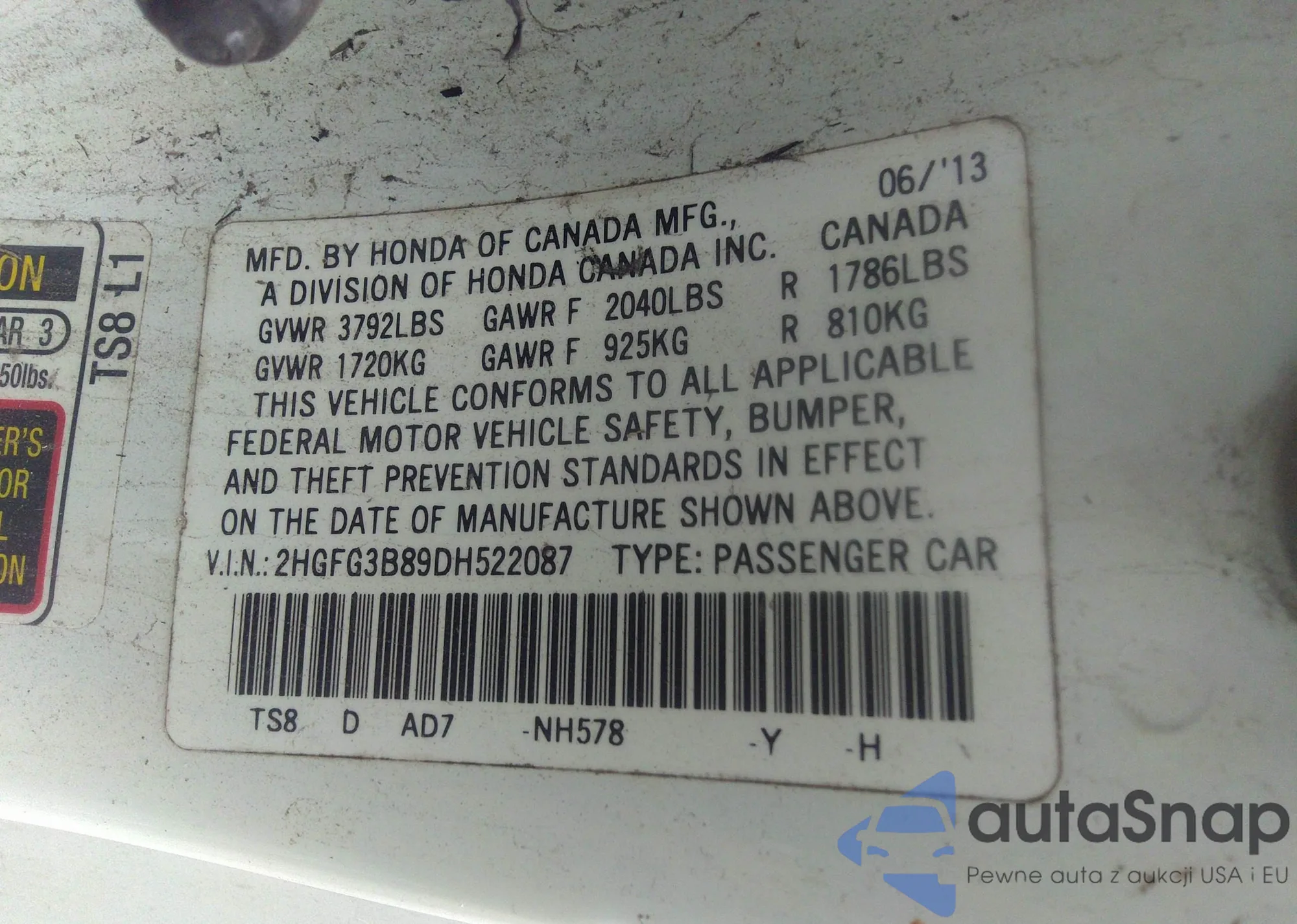 LOT: 32626273 VIN: 2HGFG3B89DH522087