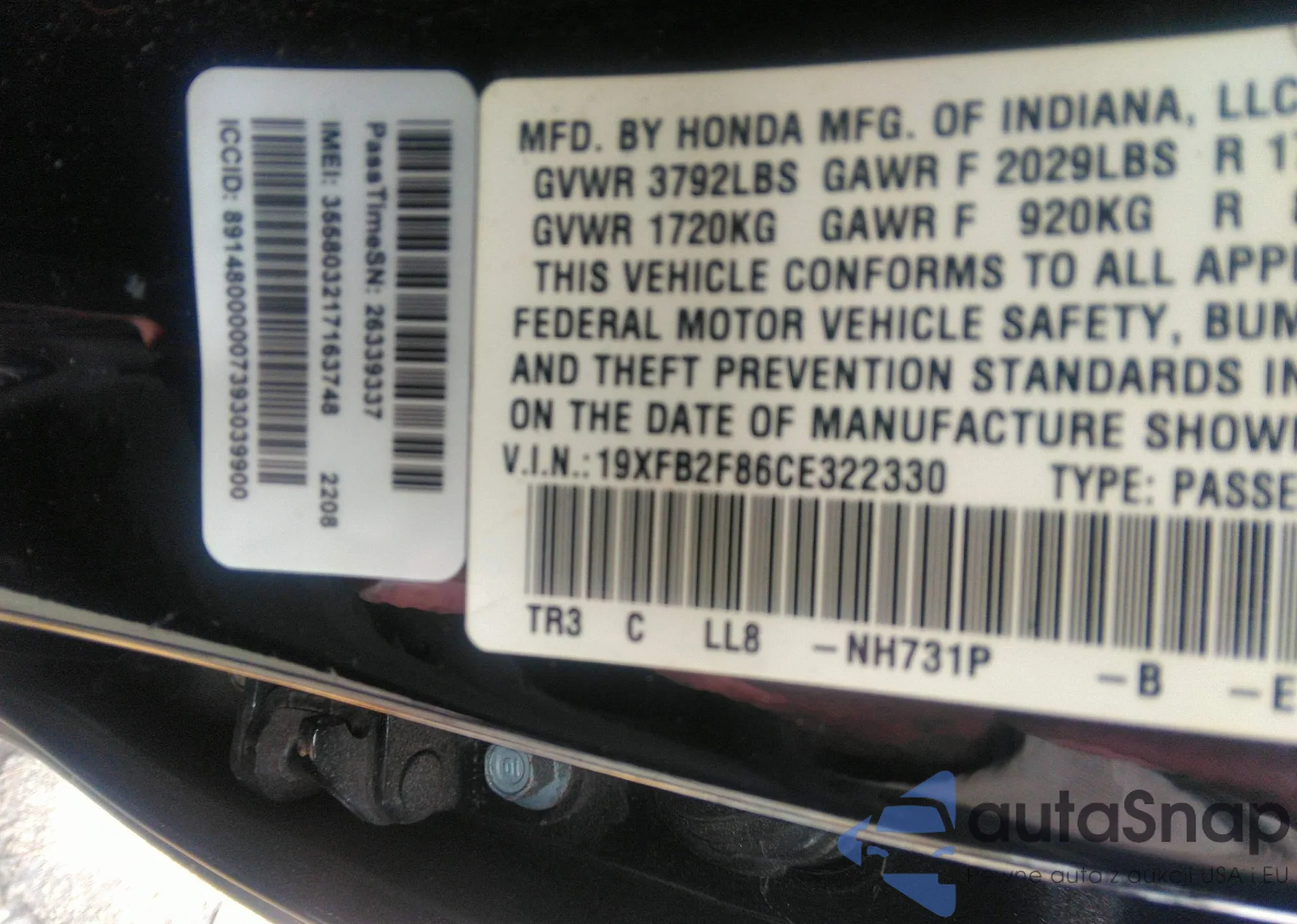 LOT: 38251720 VIN: 19XFB2F86CE322330