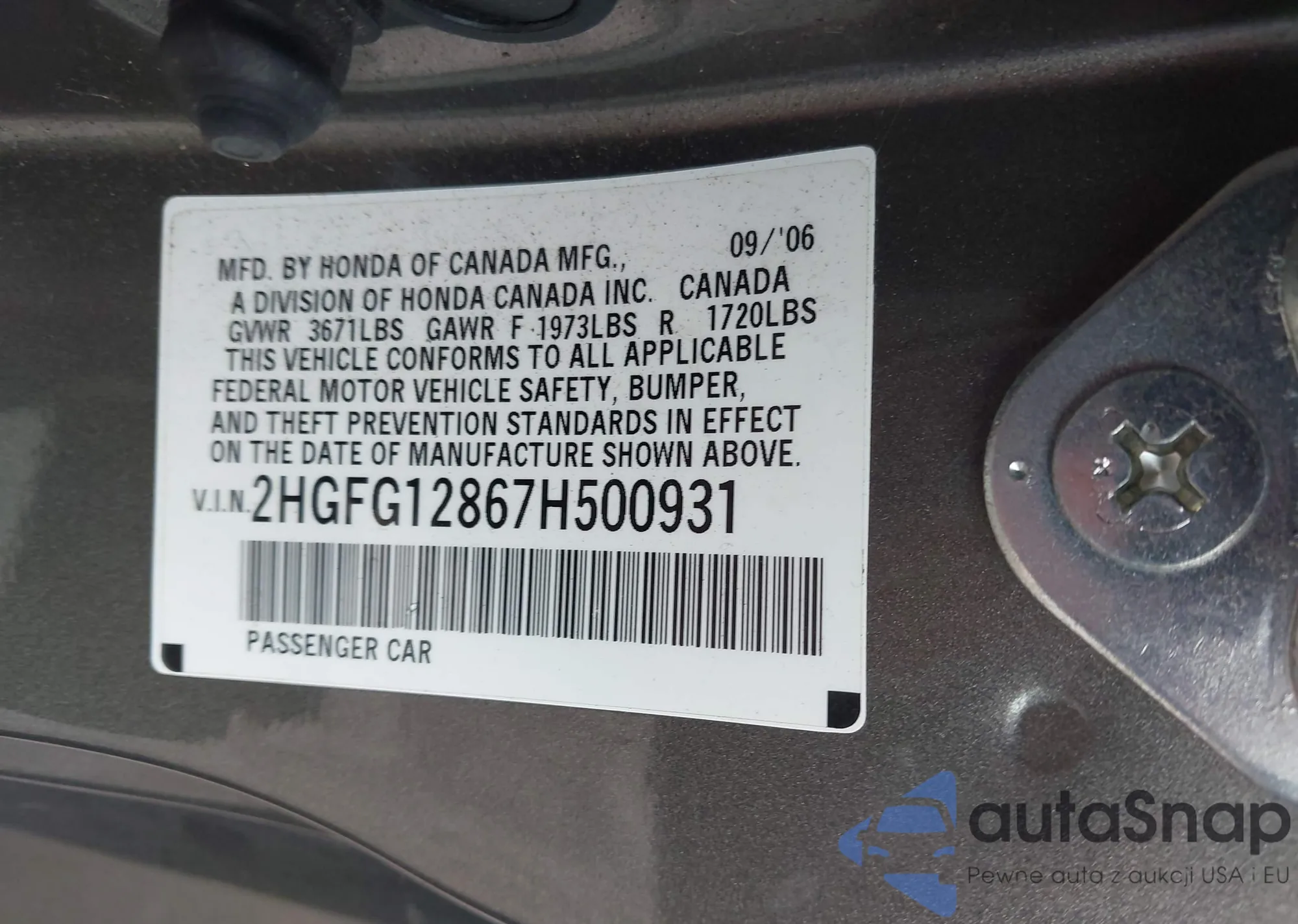 LOT: 44375574 VIN: 2HGFG12867H500931