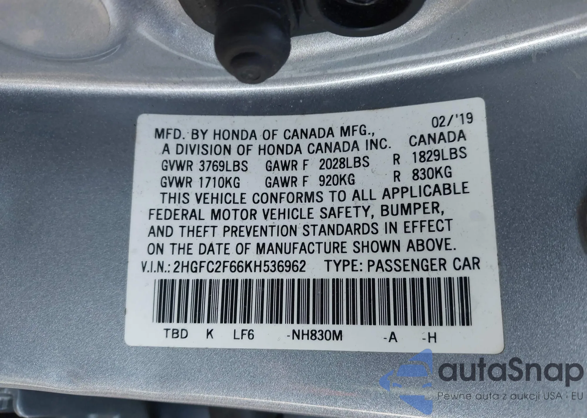 • VIN 2HGFC2F66KH536962