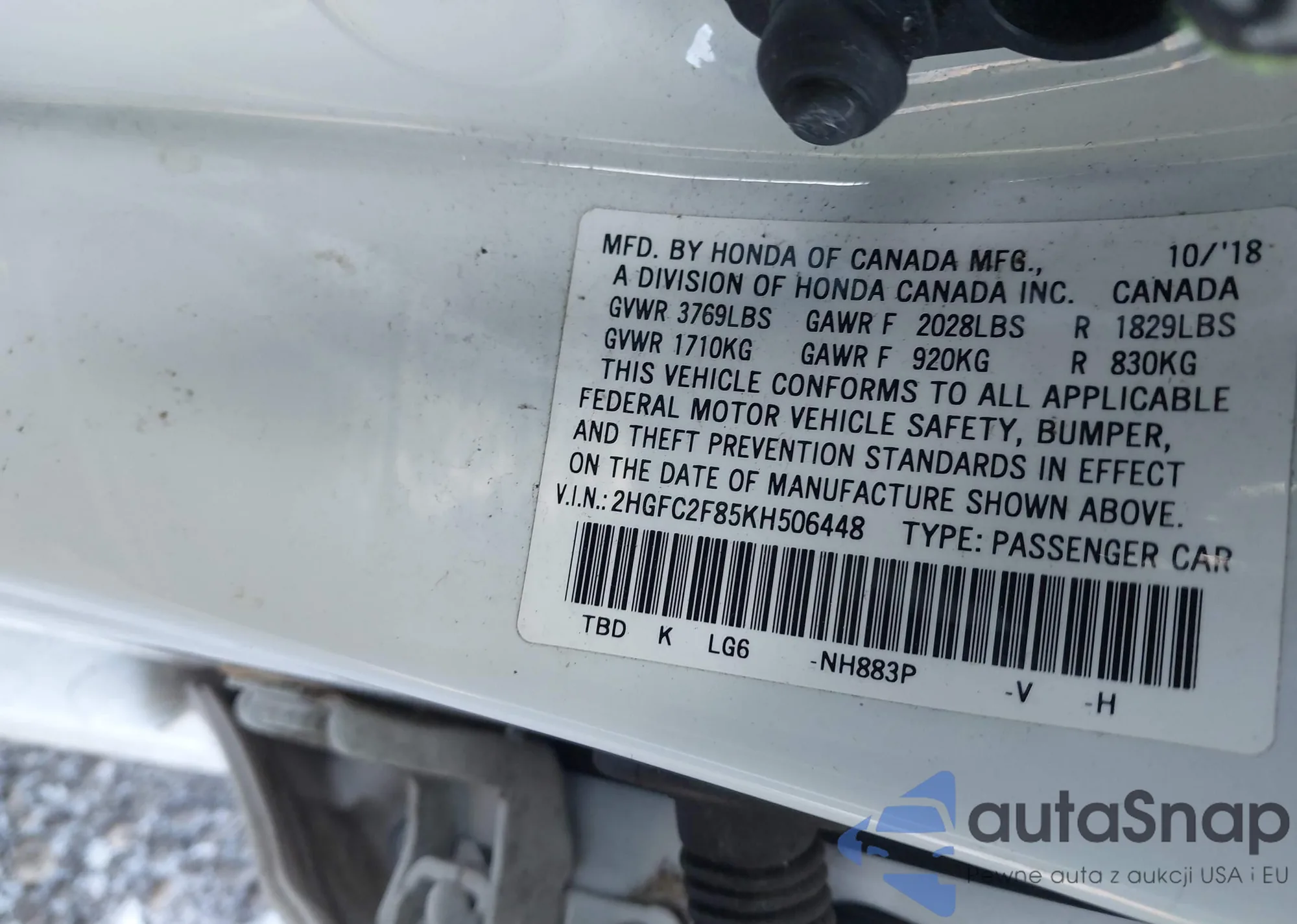 • VIN 2HGFC2F85KH506448