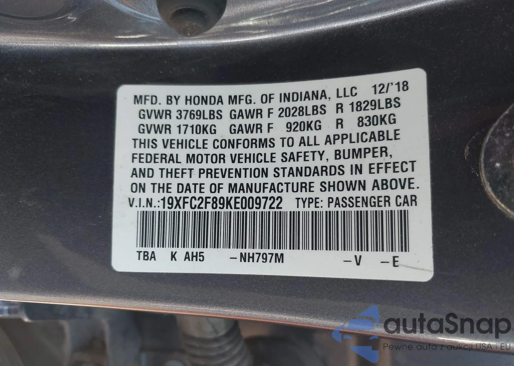 • VIN 19XFC2F89KE009722