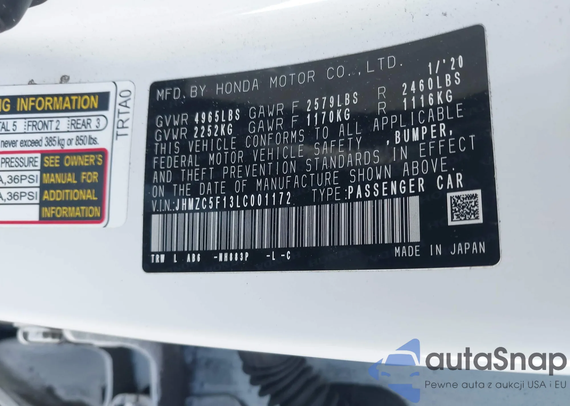 LOT: 44130443 VIN: JHMZC5F13LC001172